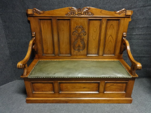 This is a stunning elm monks bench with green leather upholstered seat, 4 solid panel back, 3 solid panel base, lift up lid, lovely colour and condition.