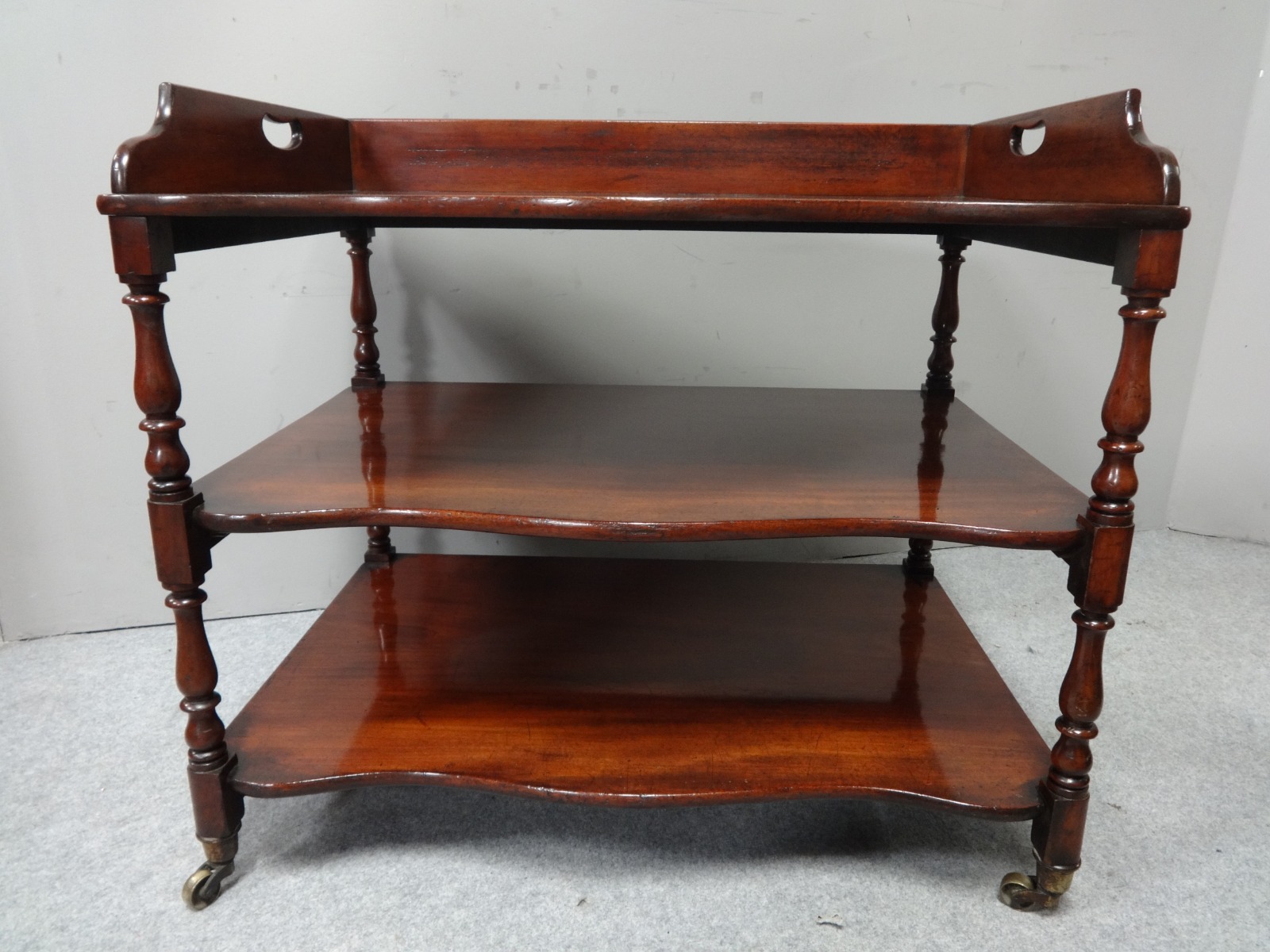 This is a very good George III antique mahogany three tier trolley with brass castors, in excellent original condition.