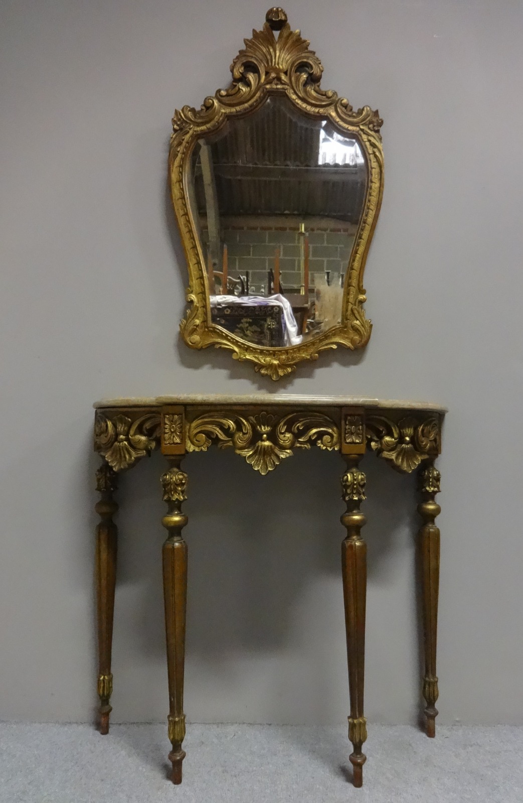 A very good carved giltwood console table with marble top and matching mirror with bevelled edge, in very good original condition.