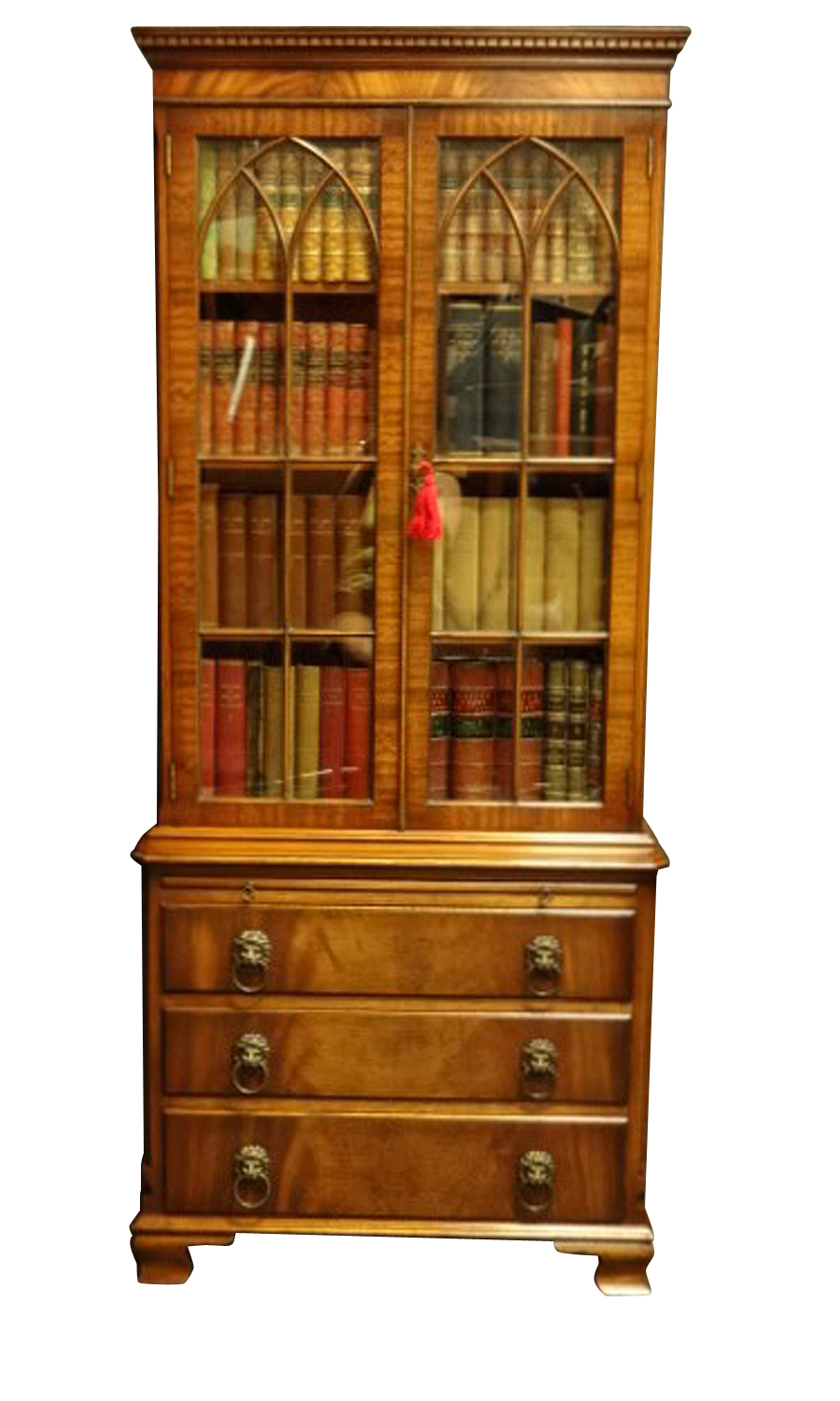 An excellent quality mahogany bookcase with adjustable shelves, sitting on a three drawer chest of drawers with brushing slide, brass lion mask handles, standing on ogee bracket feet, all in very good condition.