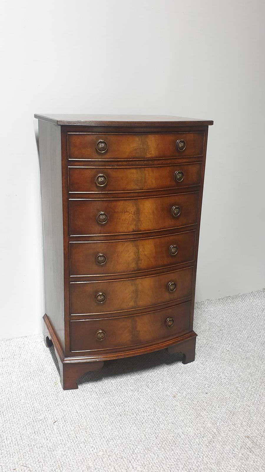 A very nice flame mahogany bowed chest of six drawers, with brass ring handles and standing on bracket feet. in very good overall original condition.