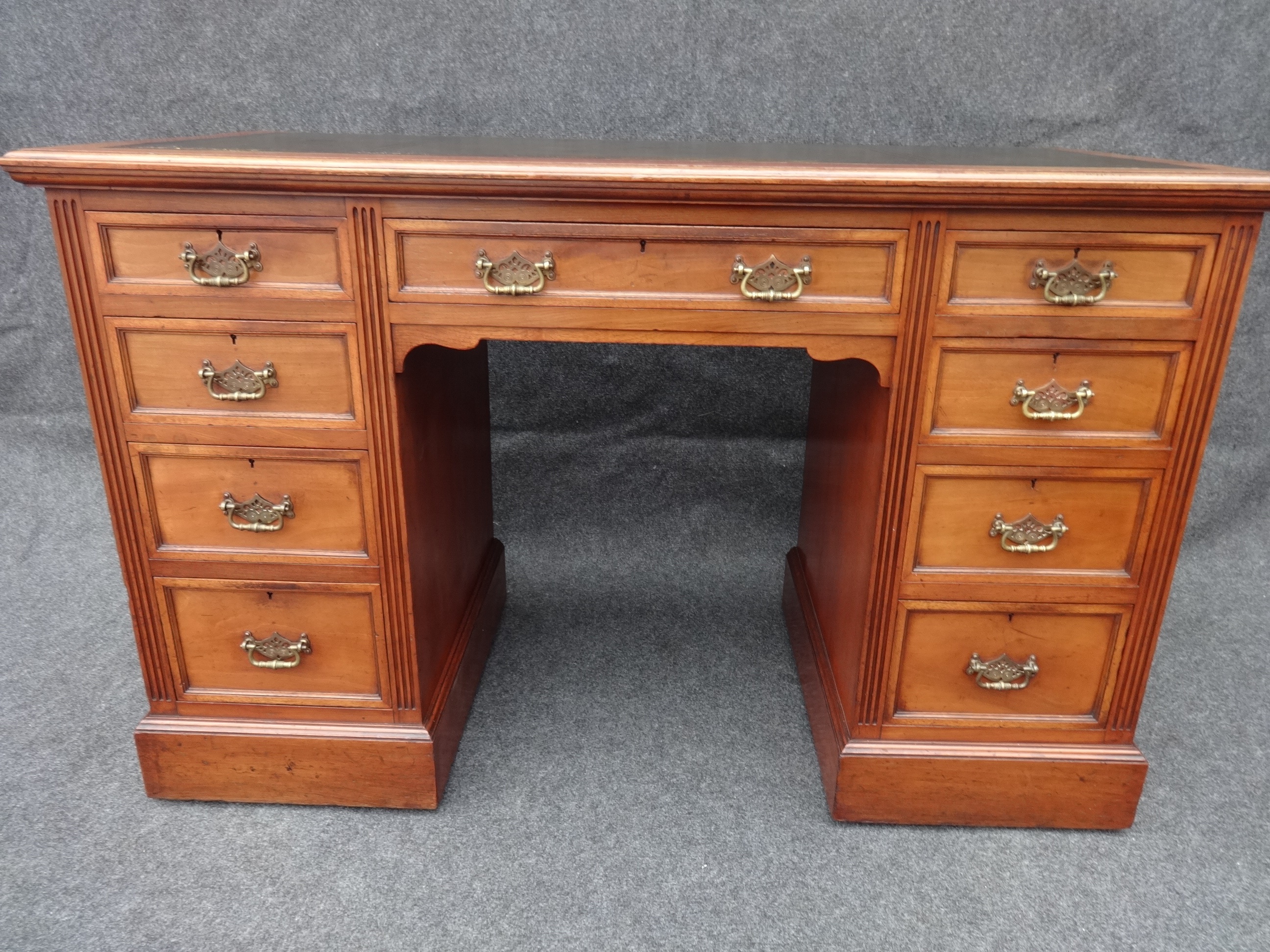 Offered for sale is this good antique Victorian mahogany desk which is in excellent condition and has nine drawers with replaced green leather, all original.