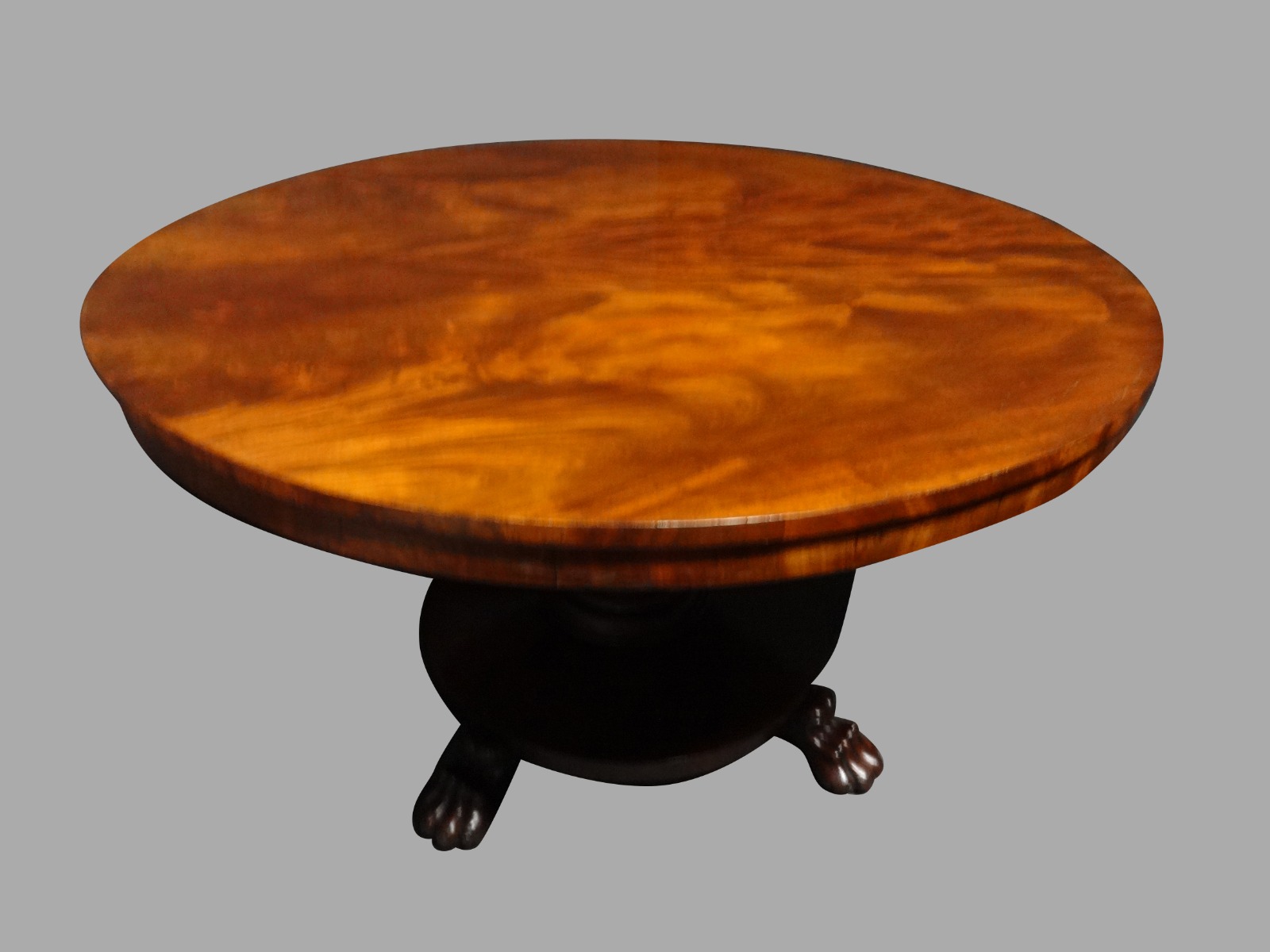 A very good mahogany flip top pedestal dining table, central pedestal onto platform base and lions paw feet, in very good condition and lovely colour.