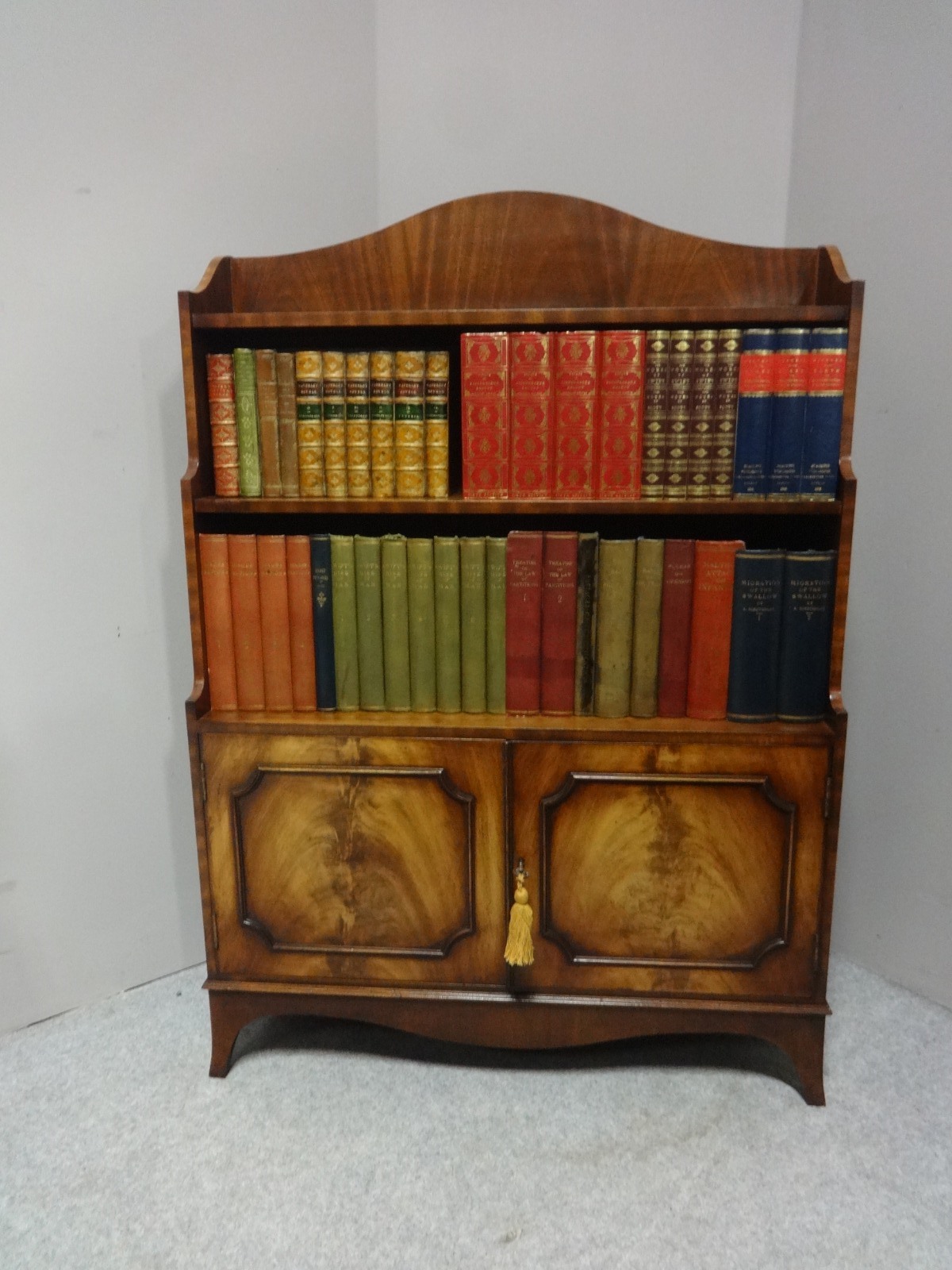 A very nice quality mahogany waterfall bookcase with cupboard below, brass handles and standing on outswept feet.