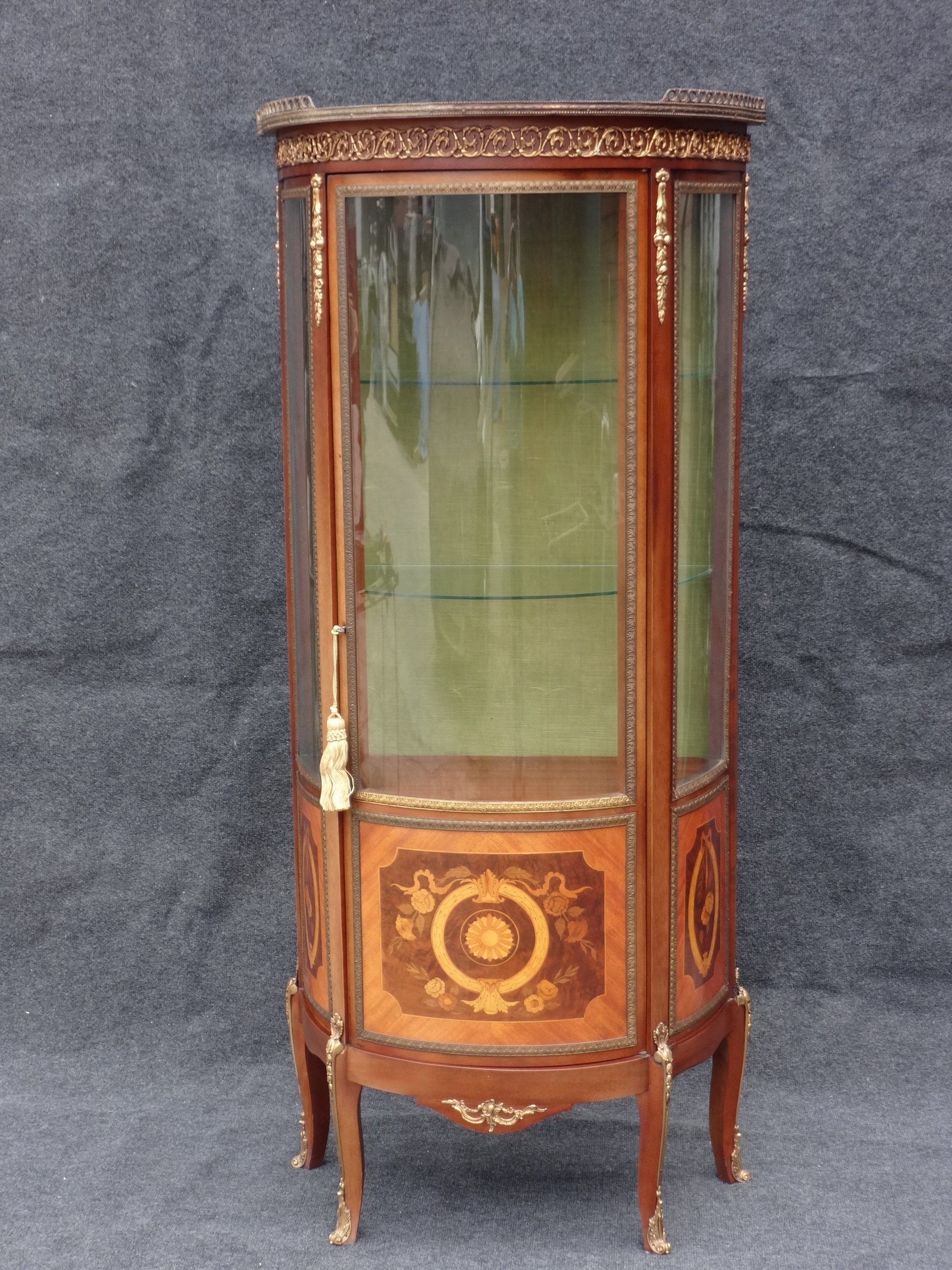 Offered for sale is this fantastic marquetry inlaid vitreen with good ormolu mounts, bowed glass, glass shelving, good marquetry inlays.