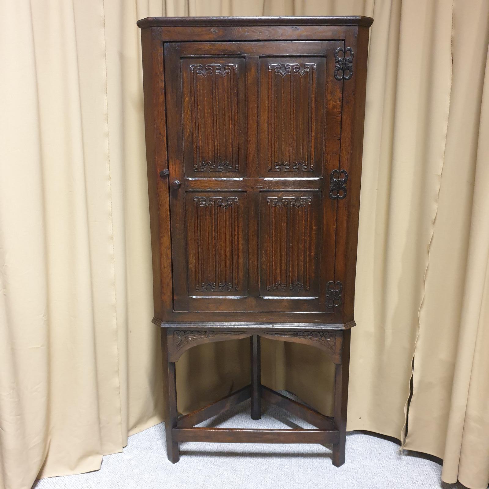 This is a very good solid oak linen fold corner cupboard with three internal shelves, solid backboards, with solid oak stand, excellent original colour and condition. Splits into two.