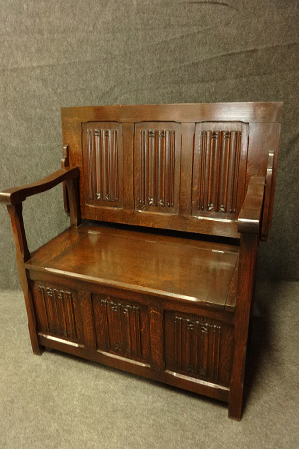 Offered for sale is this good linen fold monks bench, folds over into a table, solid oak panels, in excellent condition.