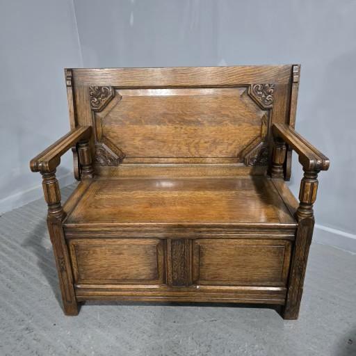 A very good medium oak hall bench, top swivells over to create a table, lift up lid for storage, excellent colour and condition.