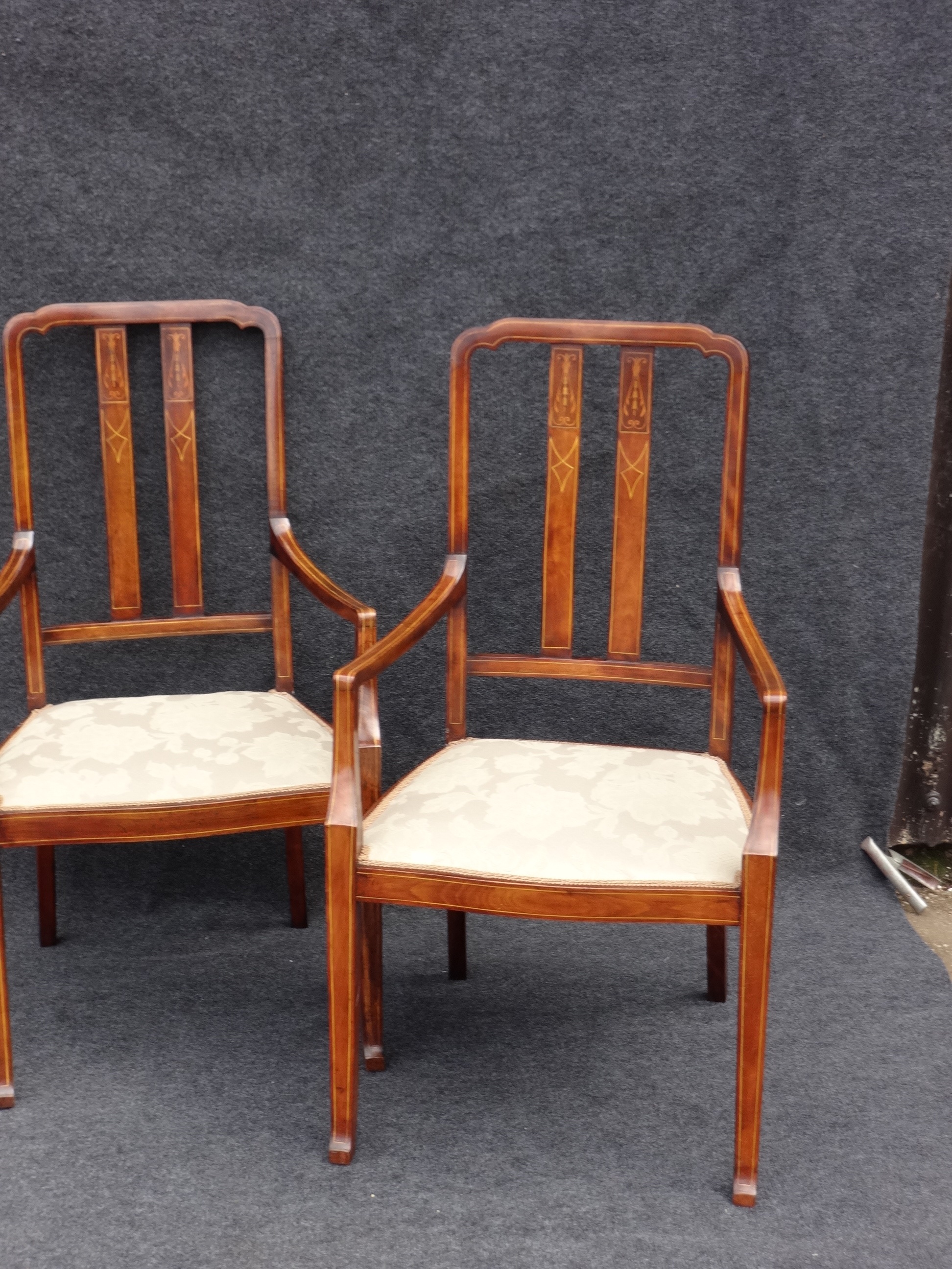 Fantastic antique chairs that have a pretty inlay and very good colour. They have been newly upholstered and are in very good original condition.