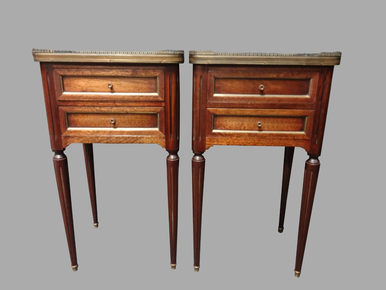 A very good pair of French Empire period mahogany two drawer chests of drawers, reeded legs with brass tips, brass gallery and white marble top, excellent colour and condition.