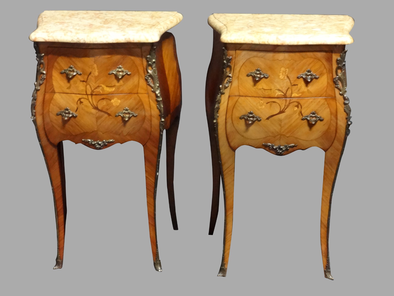 These are a very good pair of two drawer bombe shaped bedside chests of drawers with marquetry fronts, ormolu mounts, oak lined, and good marble tops, in very good condition.