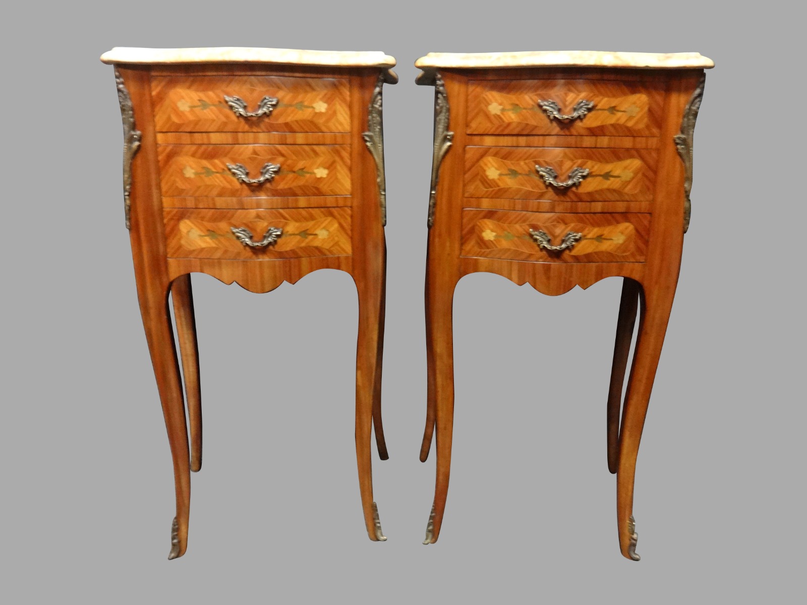These are a very good pair of serpentine kingwood and marquetry bedside chests of drawers with brass handles and mounts and cream mottled marble tops, in excellent original condition.