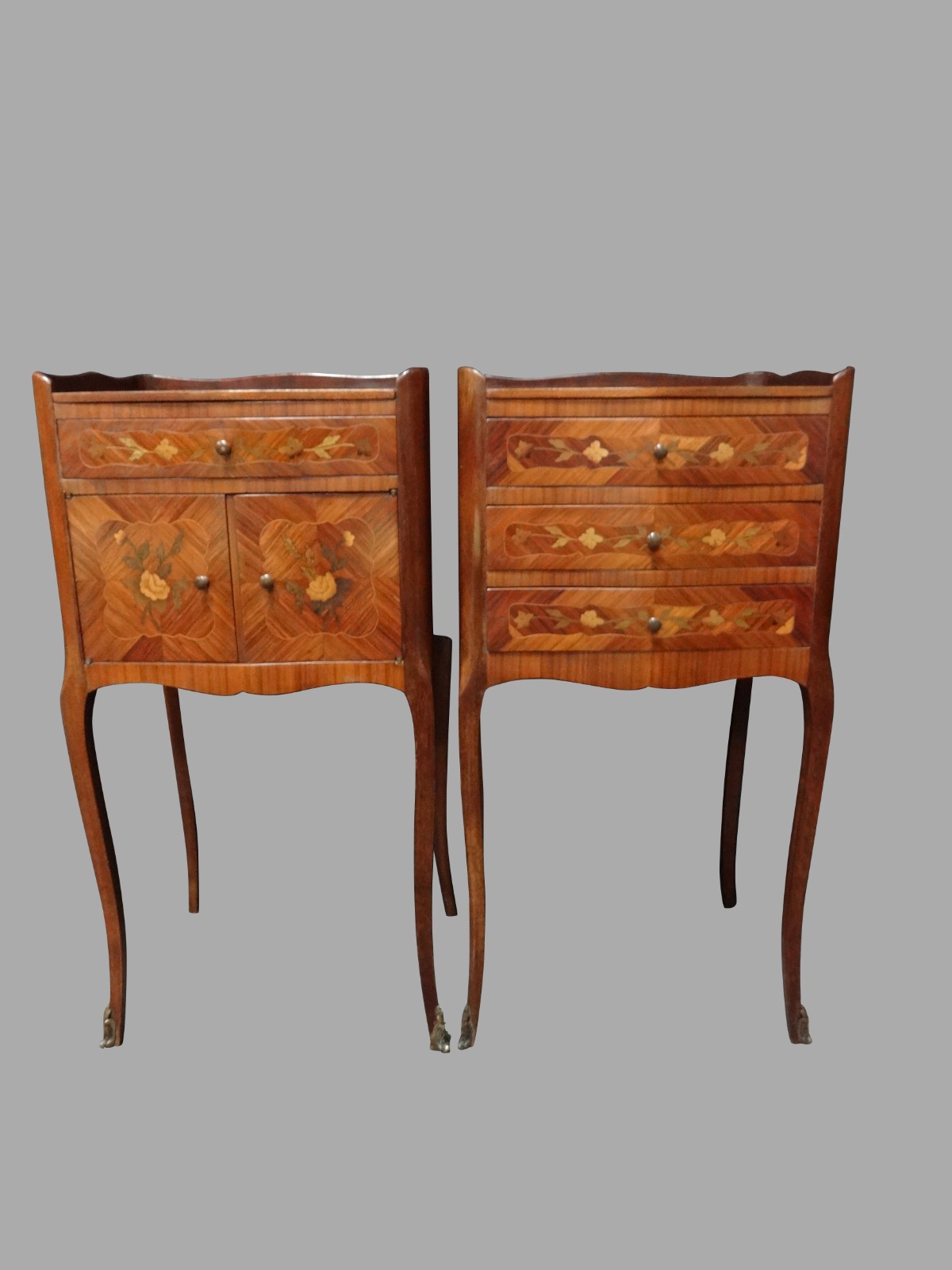 These are a fine pair of French tulipwood and marquetry bedsides one is with a single drawer and cupboard and the other three drawers, brass toes, excellent colour and condition.