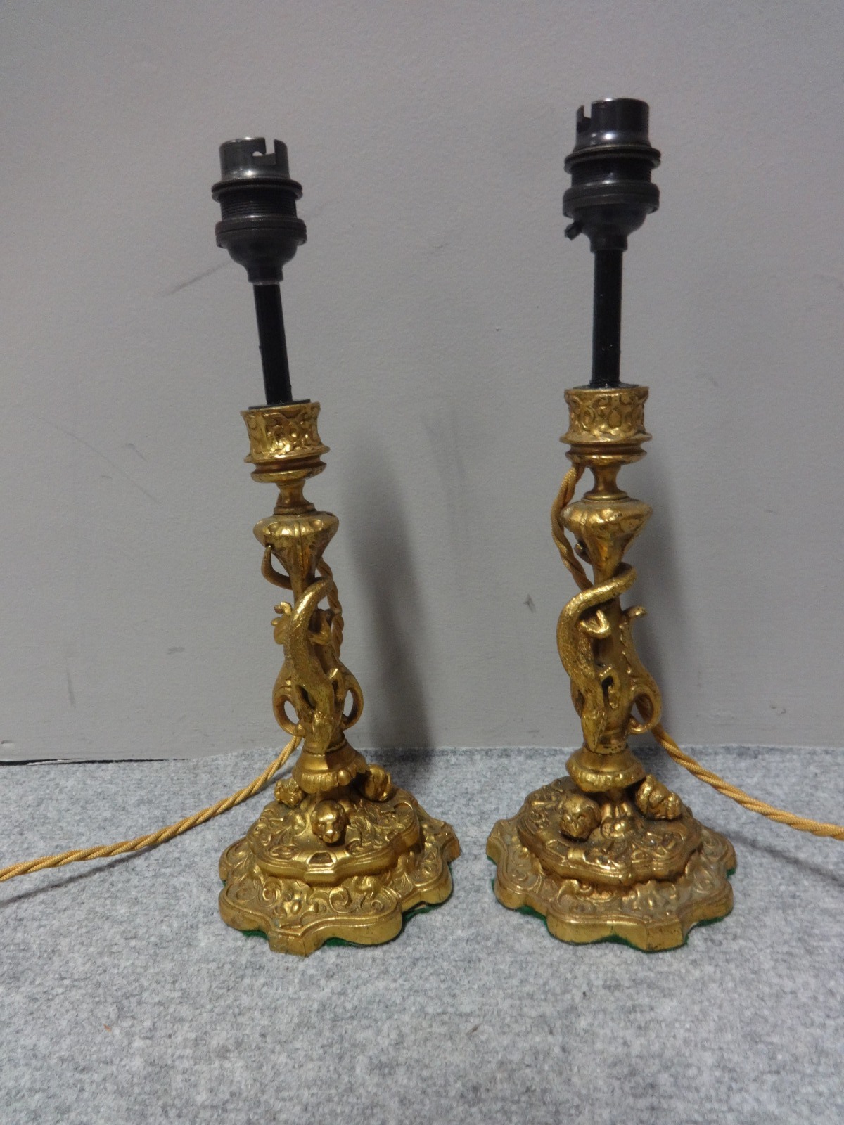 These are a very good pair of 19th Century Victorian antique gilt metal table lamps, with dogs heads and serpent detailing.