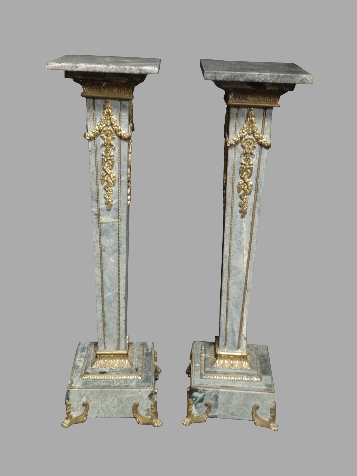 These are a very good pair of antique grey marble pedestals with brass ormolu mounts. They are in very good condition.