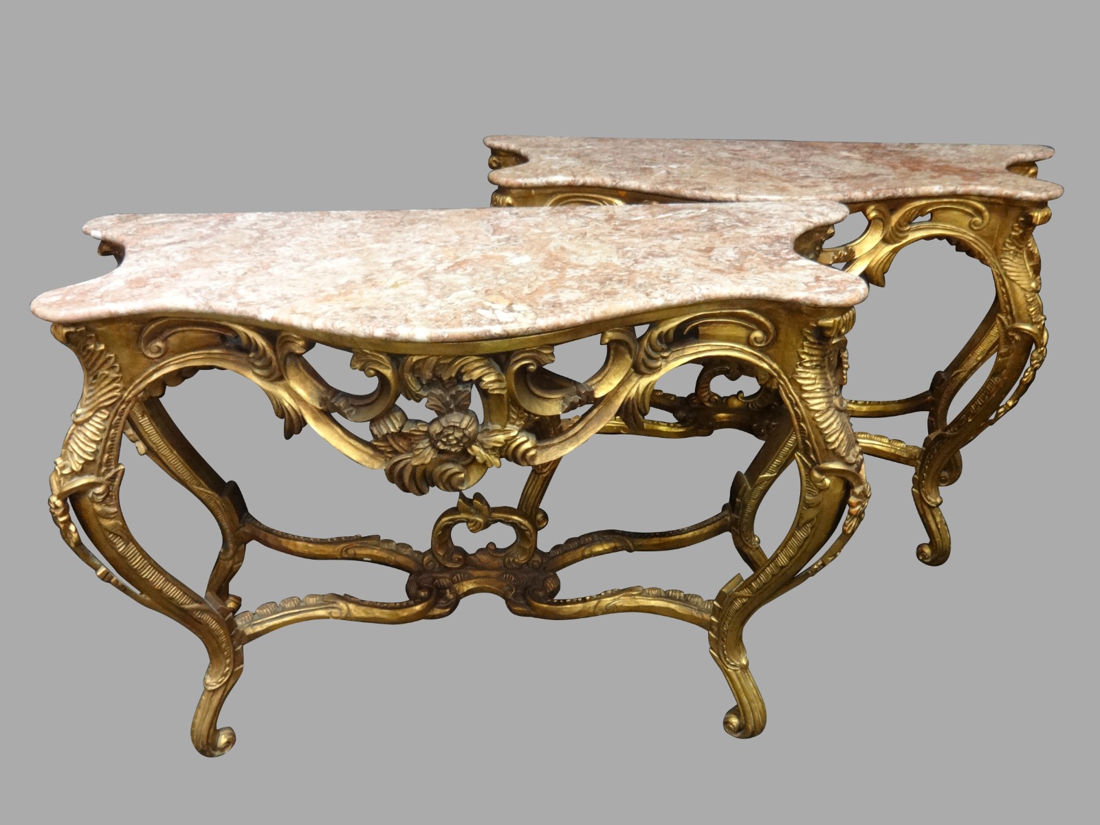 These are a very good pair of gilt console tables finely carved, with wonderful rogue marble tops, in very good condition.
