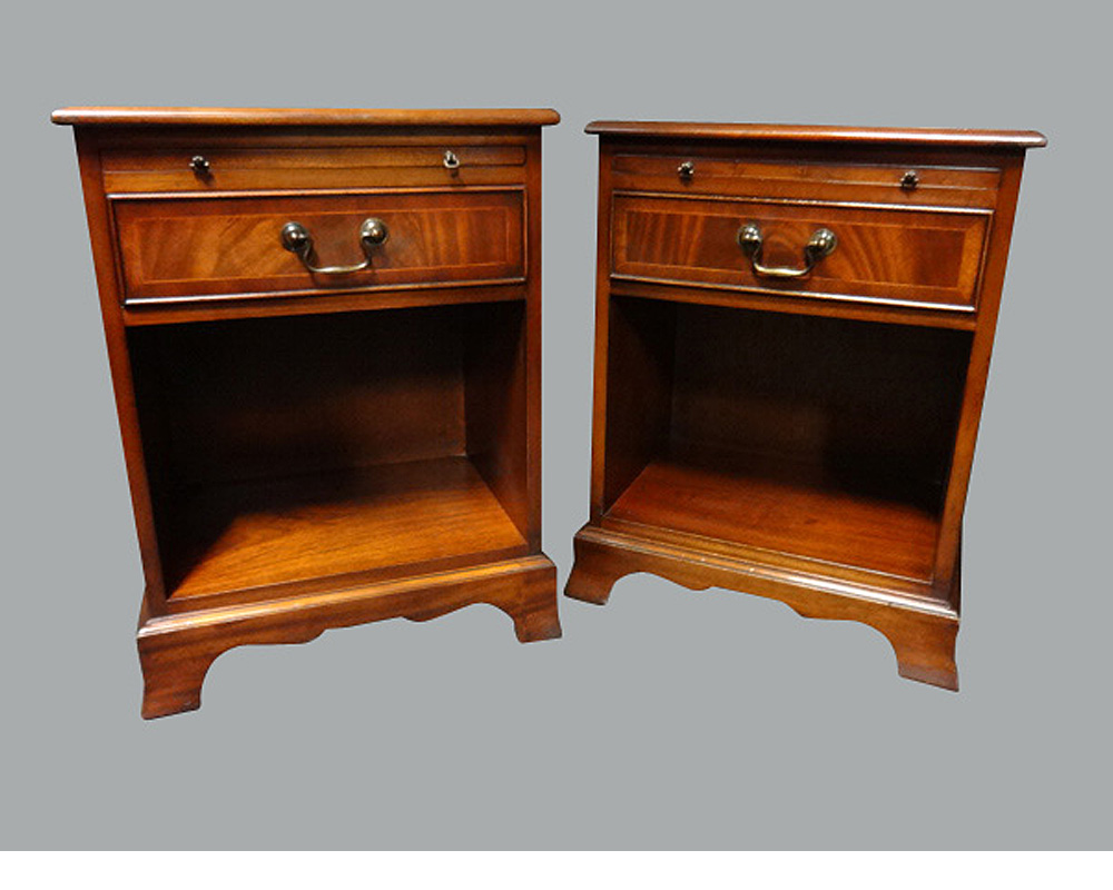 These are a very good pair of solid mahogany bedside cabinets with single drawer and brushing slide, standing on outswept bracket feet, in very good condition.