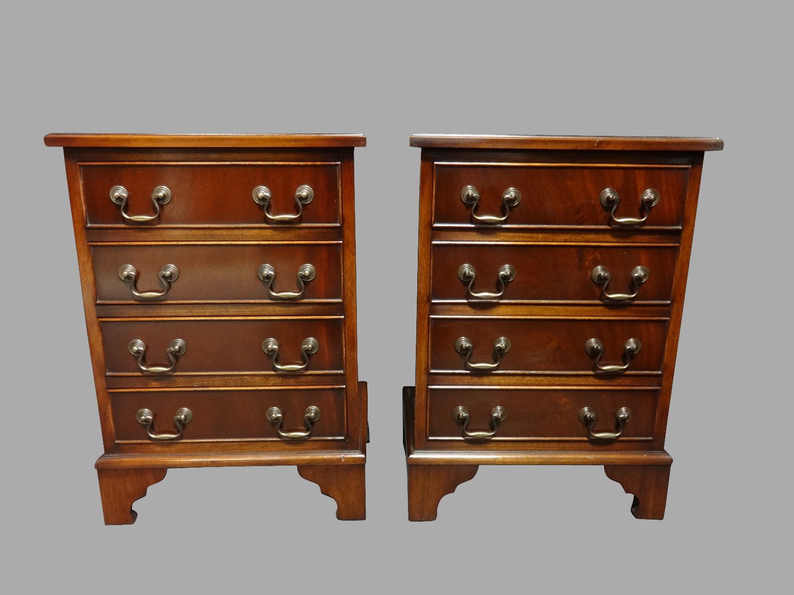 These are a good pair of mahogany four drawer chest of drawers with brass handles, inlaid to the top with tulipwood, standing on bracket feet, in very good original condition.