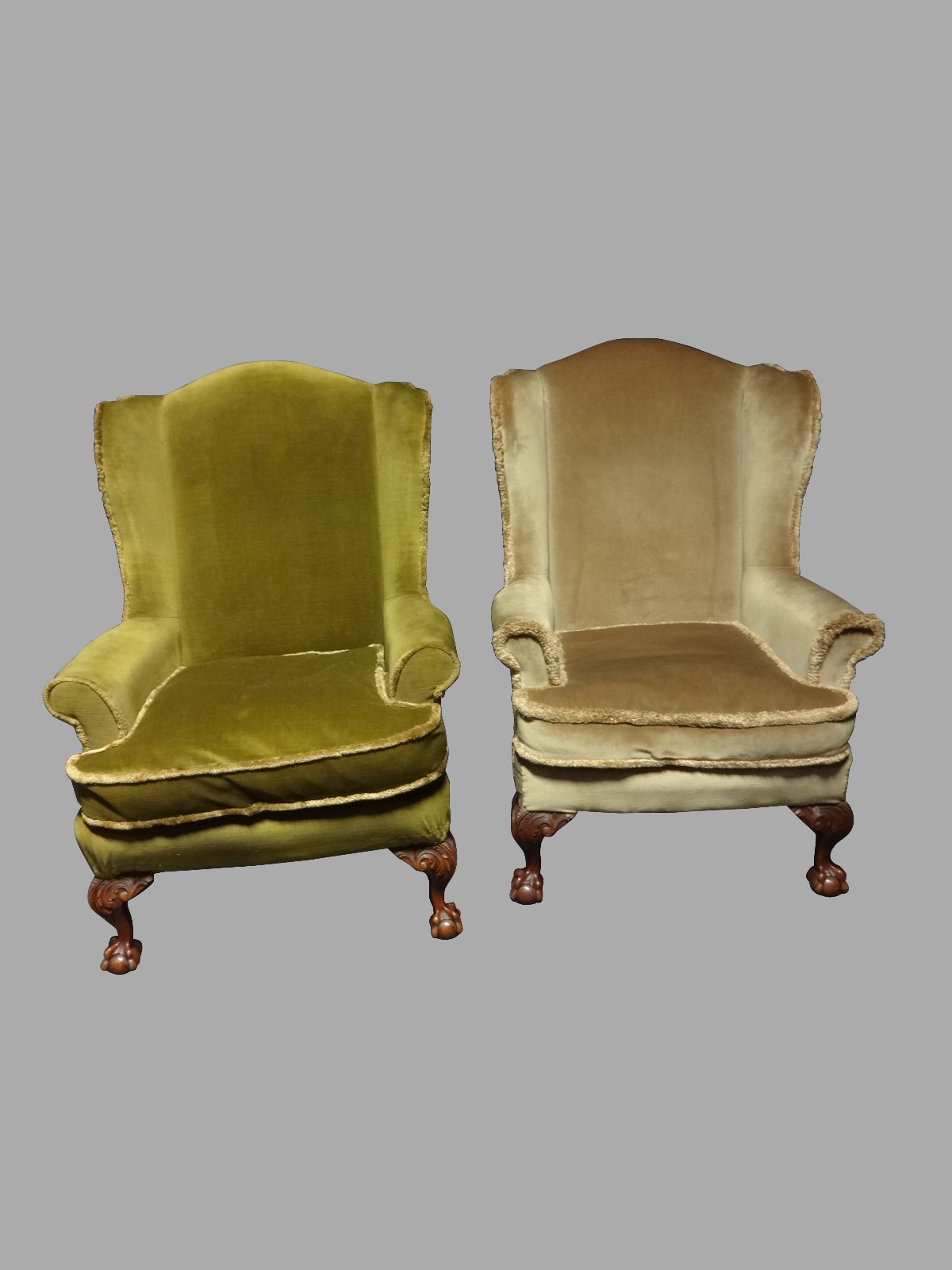 These are a very good pair of mahogany framed wing armchairs, ball and claw feet, upholstery in original very good condition, one upholstered in pale green the other in pale gold, will complement each other.