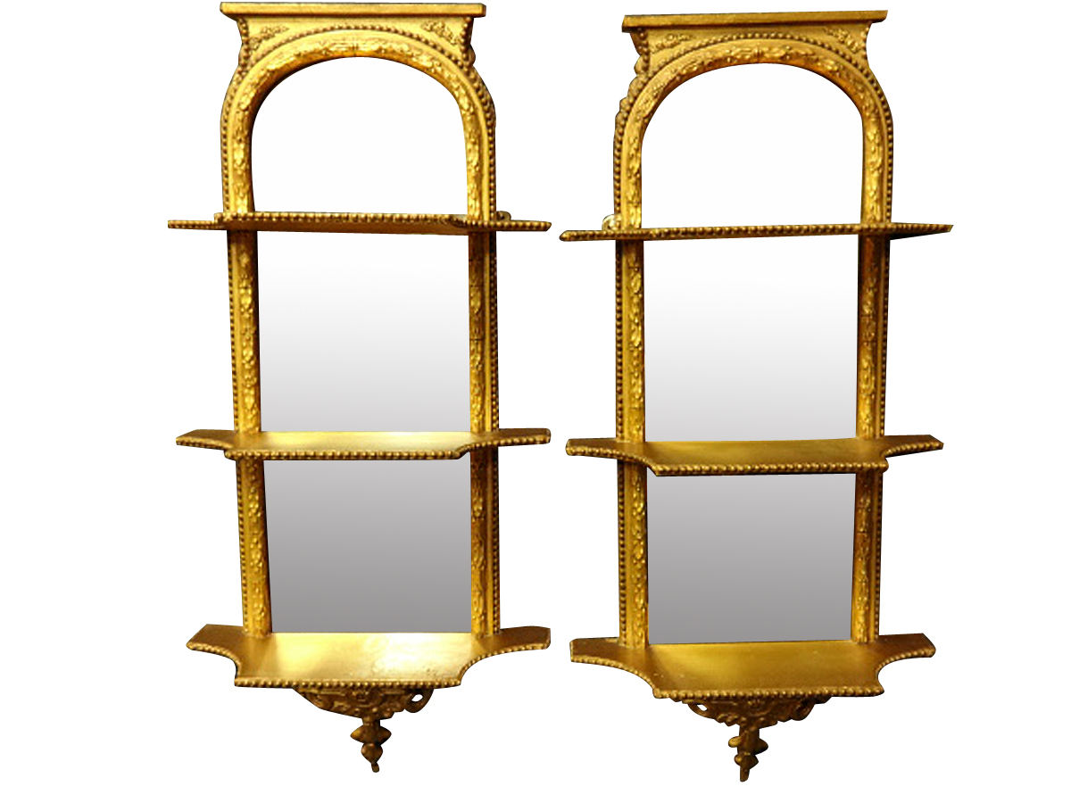 This is a very good pair of Victorian antique gilt pier mirrors, each with three shelves, replacement backs, in very good original condition.
