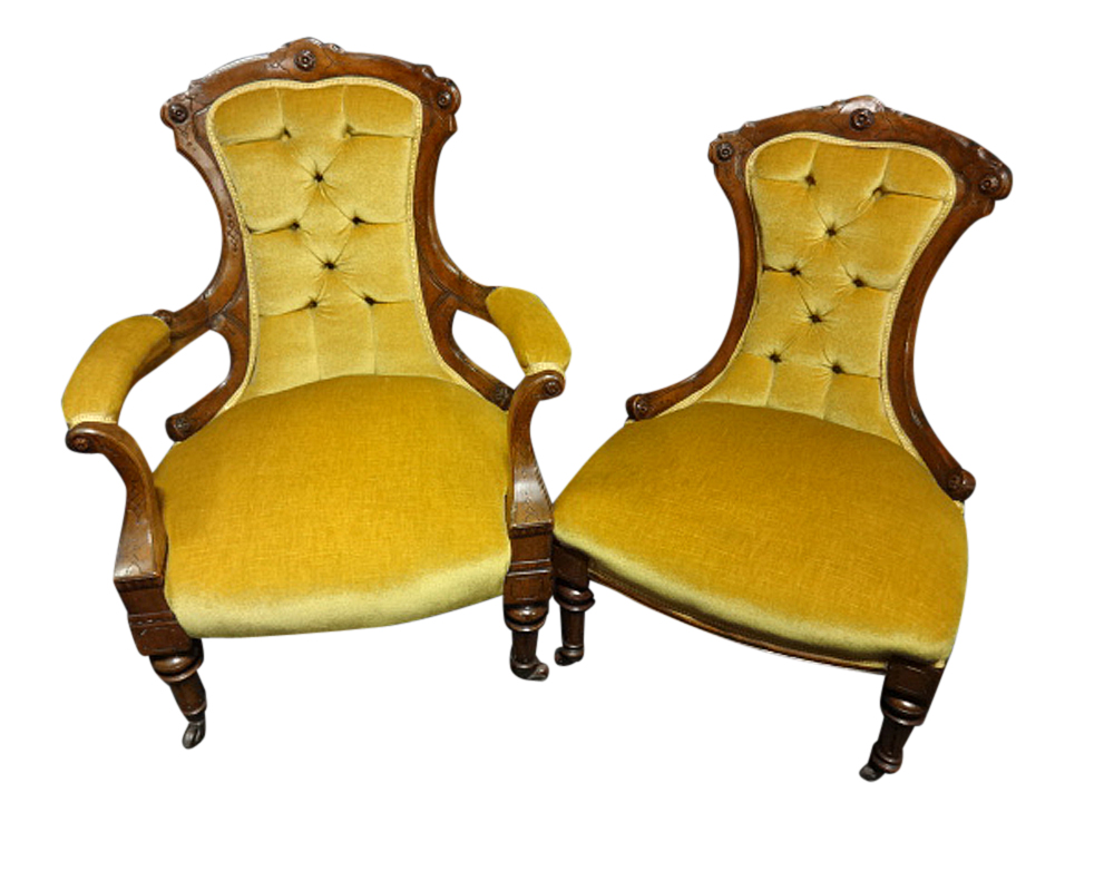 In very good original condition a good pair of Victorian walnut chairs, standing on turned legs with porcelain castors, deep buttoned upholstery.