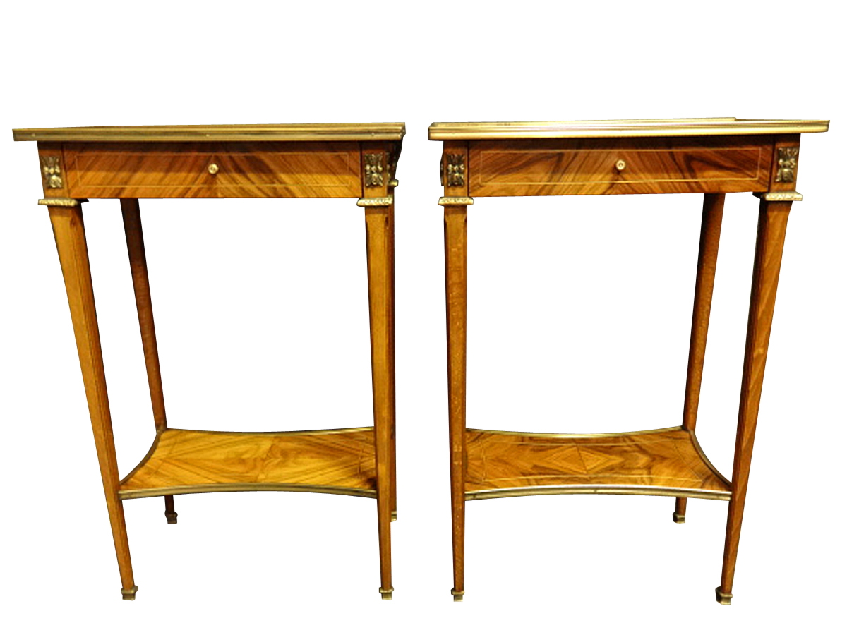A very good pair of walnut inlaid side tables, with brass edges to the top and under tier, brass feet and mounts, single full width drawer, in excellent condition.