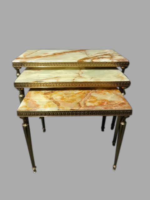 These are a very good nest of three onyx tables with brass frame and legs, in good original condition.