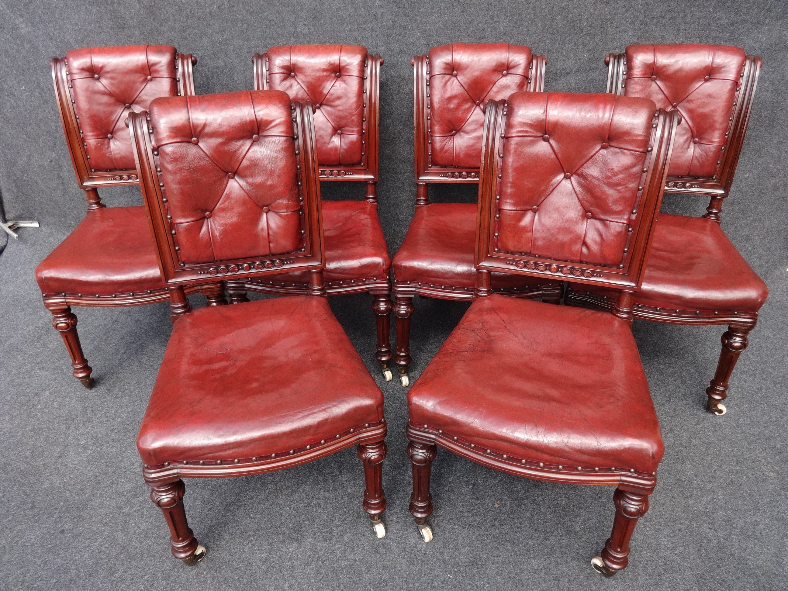 In very good condition, original leather covered dining chairs, button backed and brass studs. mahogany framed standing on brass castors with white porcelain rollers, stamped Cope and Collinson.