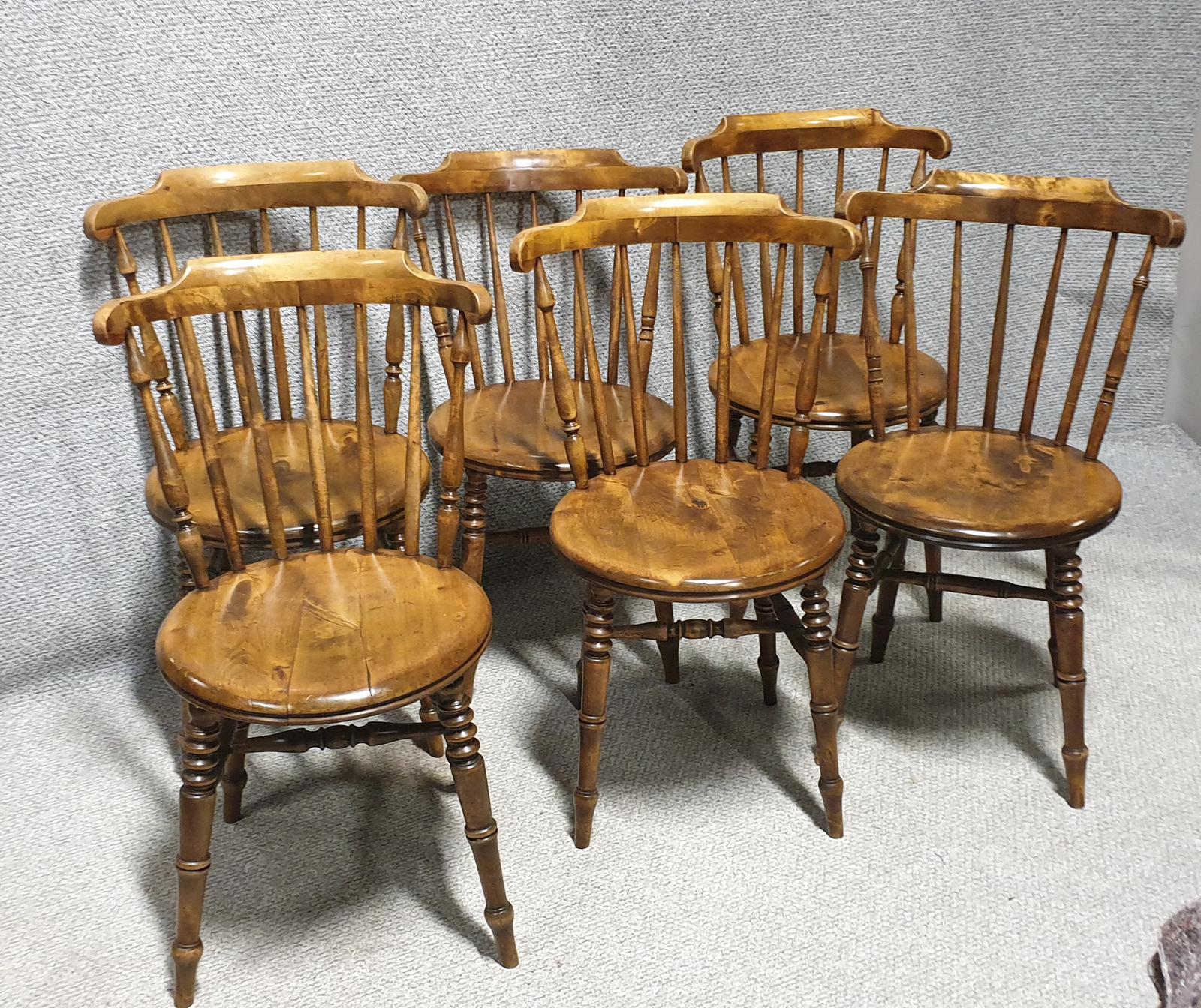 A very nice set of penny seat beech kitchen chairs with turned legs and spindle backs, excellent colour and condition. Each with IBEX sticker.