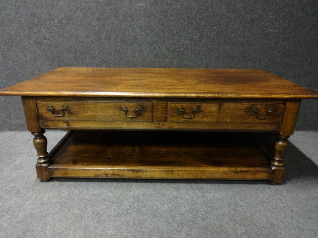 Excellent quality solid plank oak coffee table, with 2 drawers, standing on turned legs with a plank potboard base, top quality early C20th table, with brass handles, excellent quality and condition.