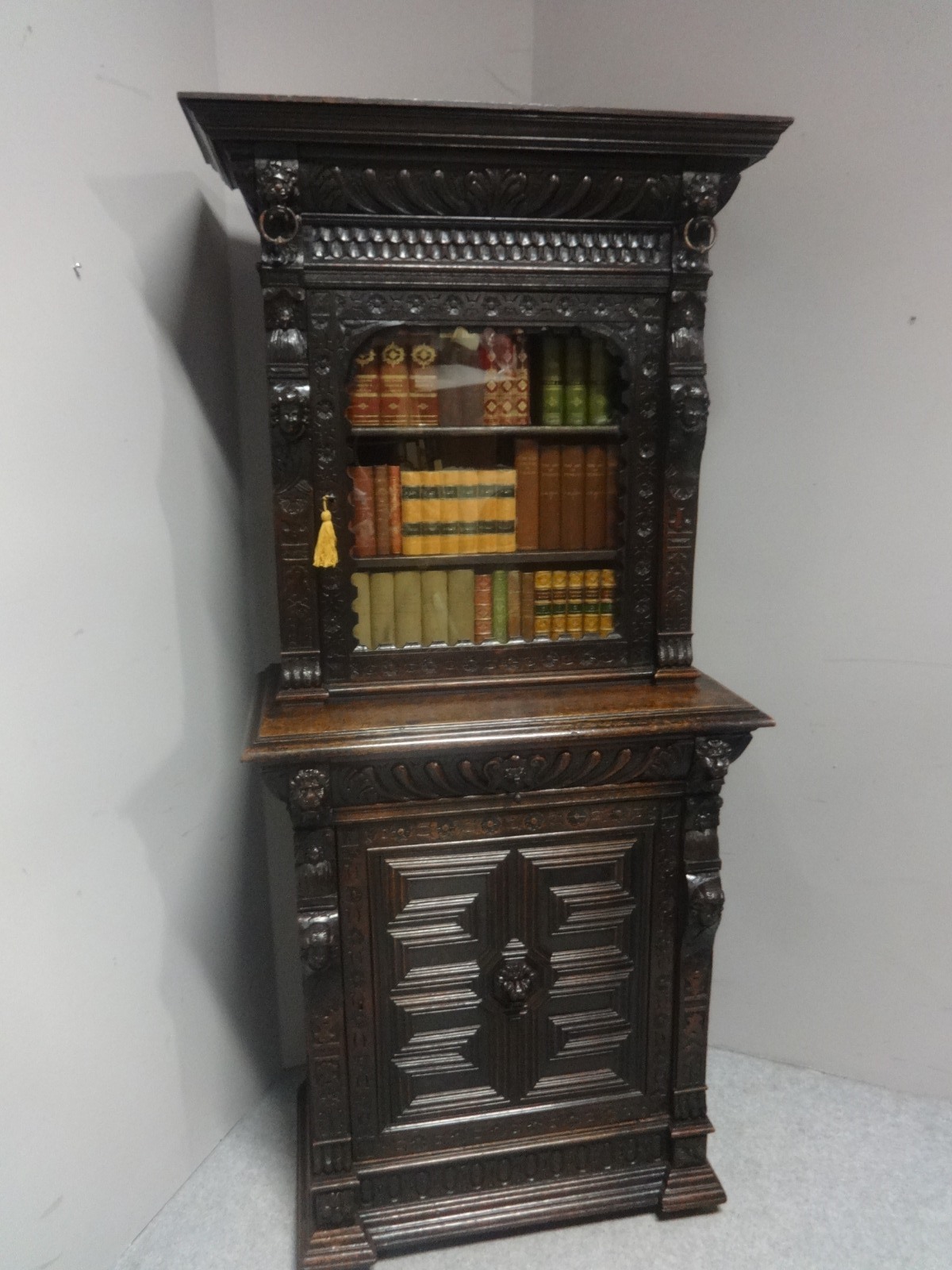 A very good 19th Century Victorian antique carved oak bookcase with two shelves on single door cupboard with drawer over. Excellent colour and condition.