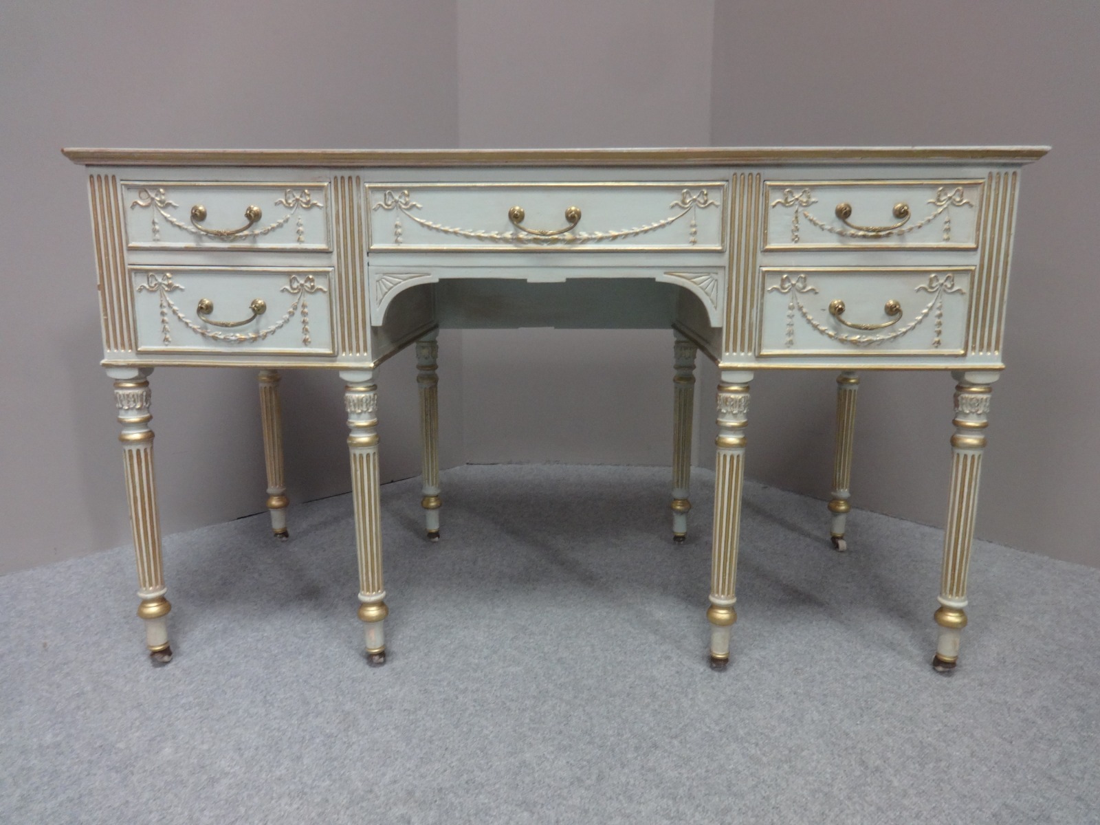 This is a very good six leg painted and parcel gilt five drawer desk, brass handles, toes and white porcelain castors tan coloured leather, in very good condition.