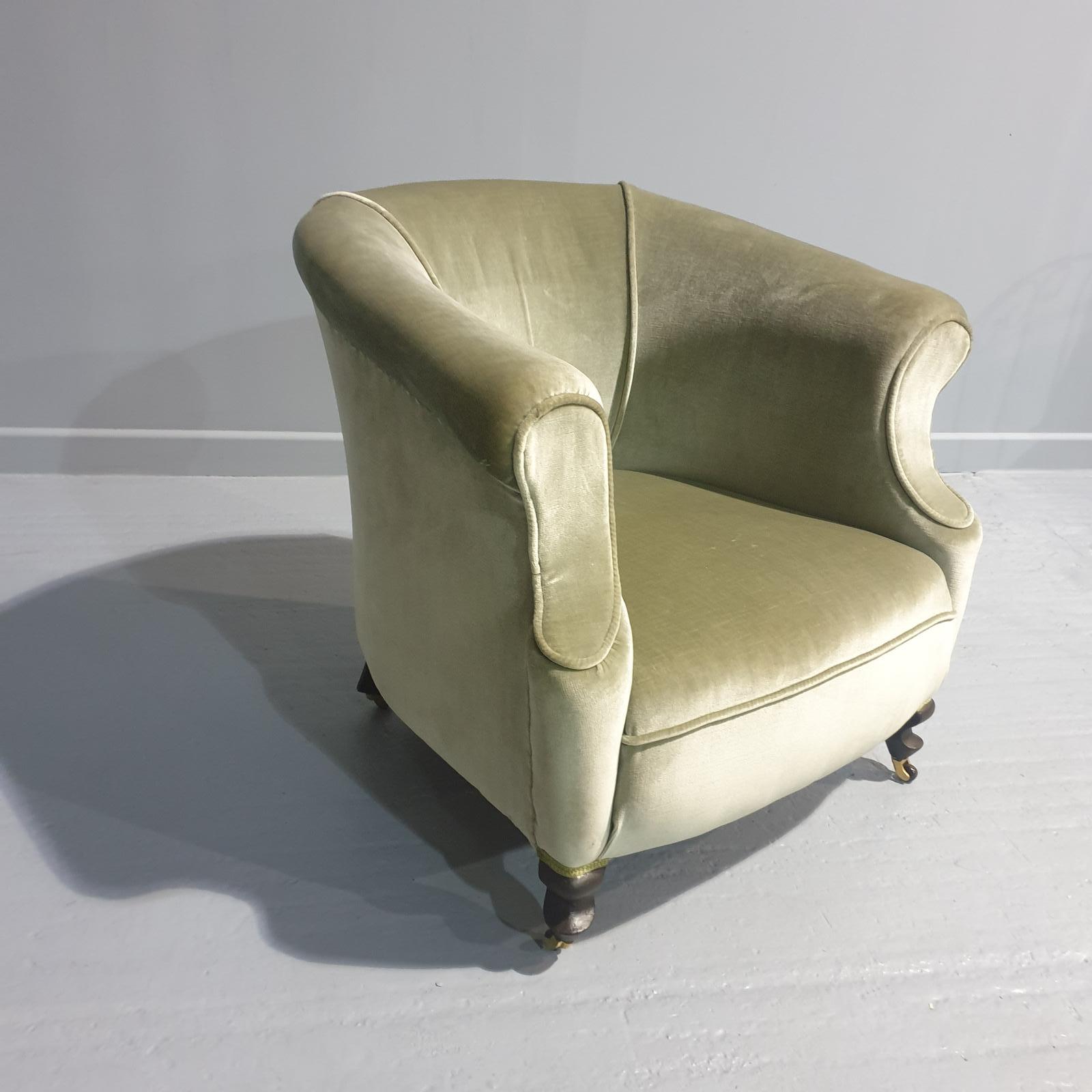 This is a very nice late 19th Century Victorian antique tub chair, standing on squat cabriole legs and covered in green plush, in great overall condition.