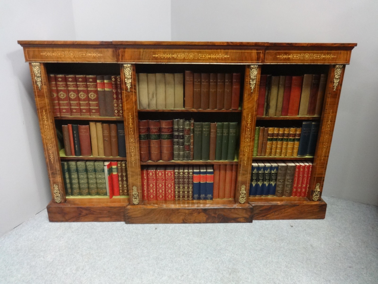 A very good burr walnut breakfront open bookcase, marquetry inlaid, ormolu mounts, in very good condition.