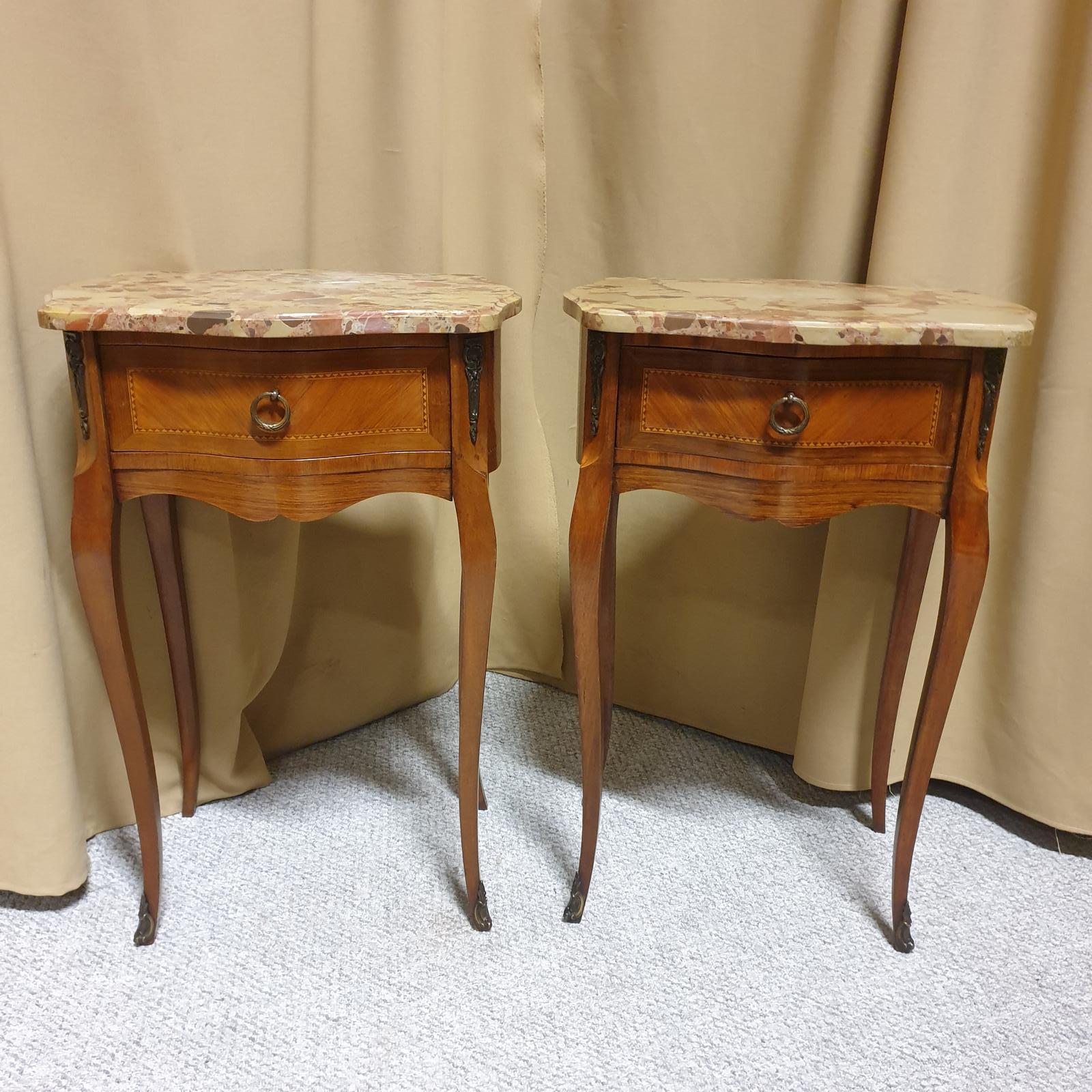 A very good pair of French inlaid bedside lamp tables, with single drawer and top quality marble tops, excellent colour and condition.