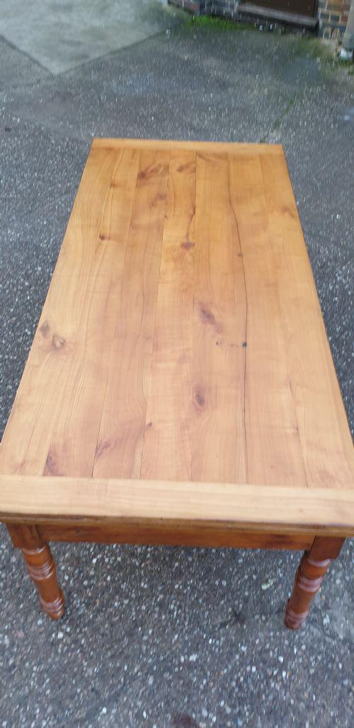 A huge French cherry extending farmhouse kitchen table, drawers out with two leaves, fully extended seats 16+, fabulous colour.