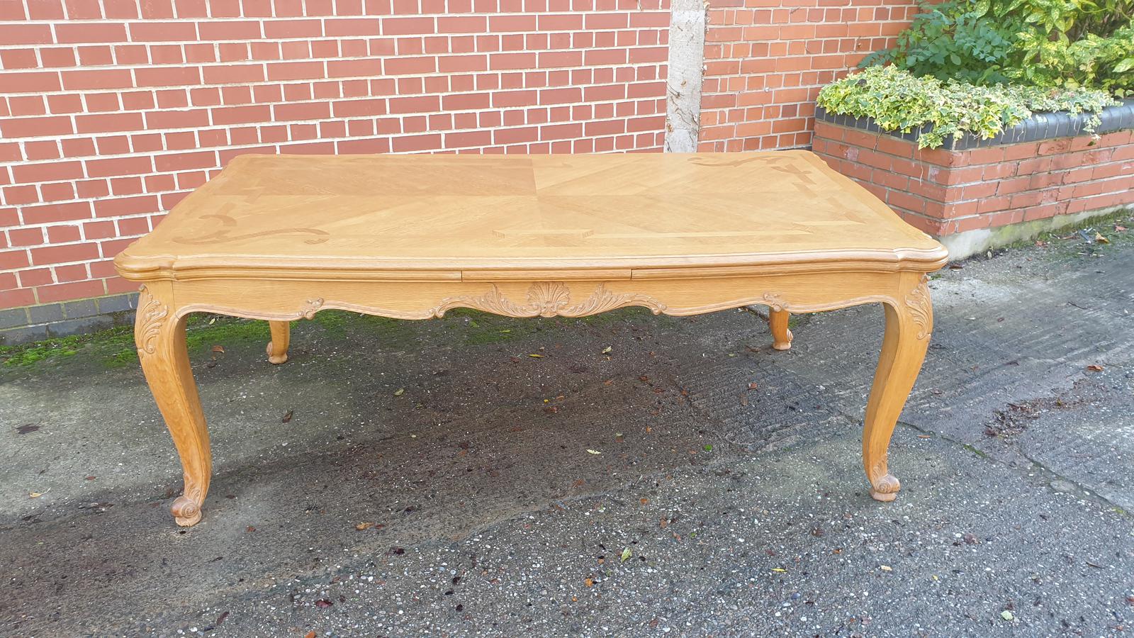 A superb quality French oak dining table, with two draw leaves, inlaid top, standing on carved cabriole legs superb colour and condition.