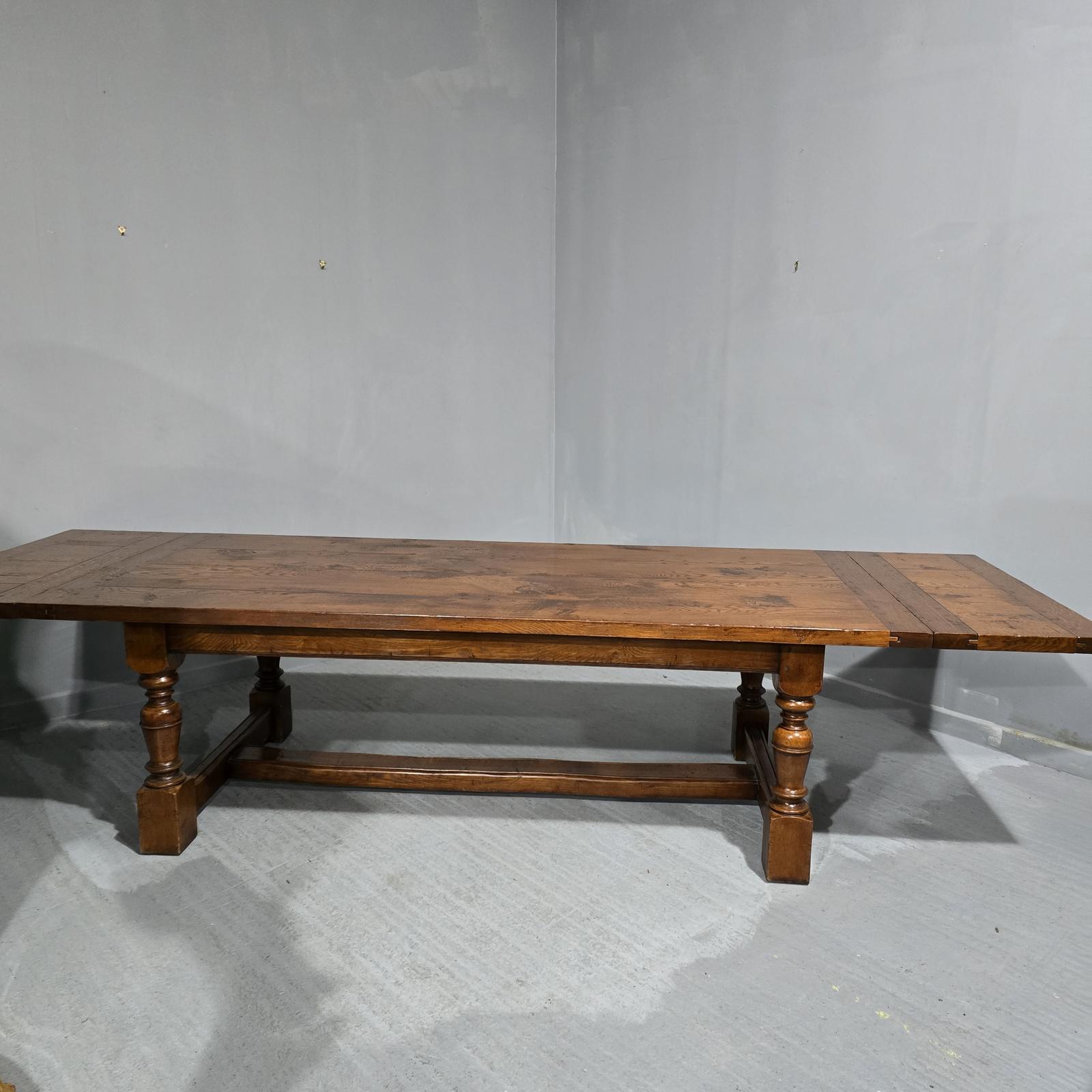 Exceptional oak plank refectory table, four plank top, extension leaves do or do not have to be used, wonderful burr oak 2 inch thickness planks, in excellent condition.