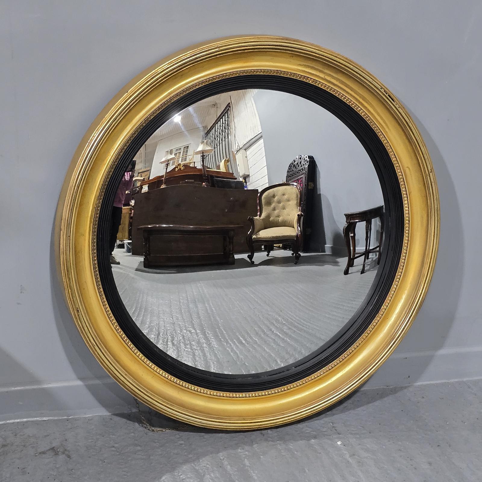 This is a large round English gilt mirror with ribbed inner rim, slight convex original mirror, in great overall condition.