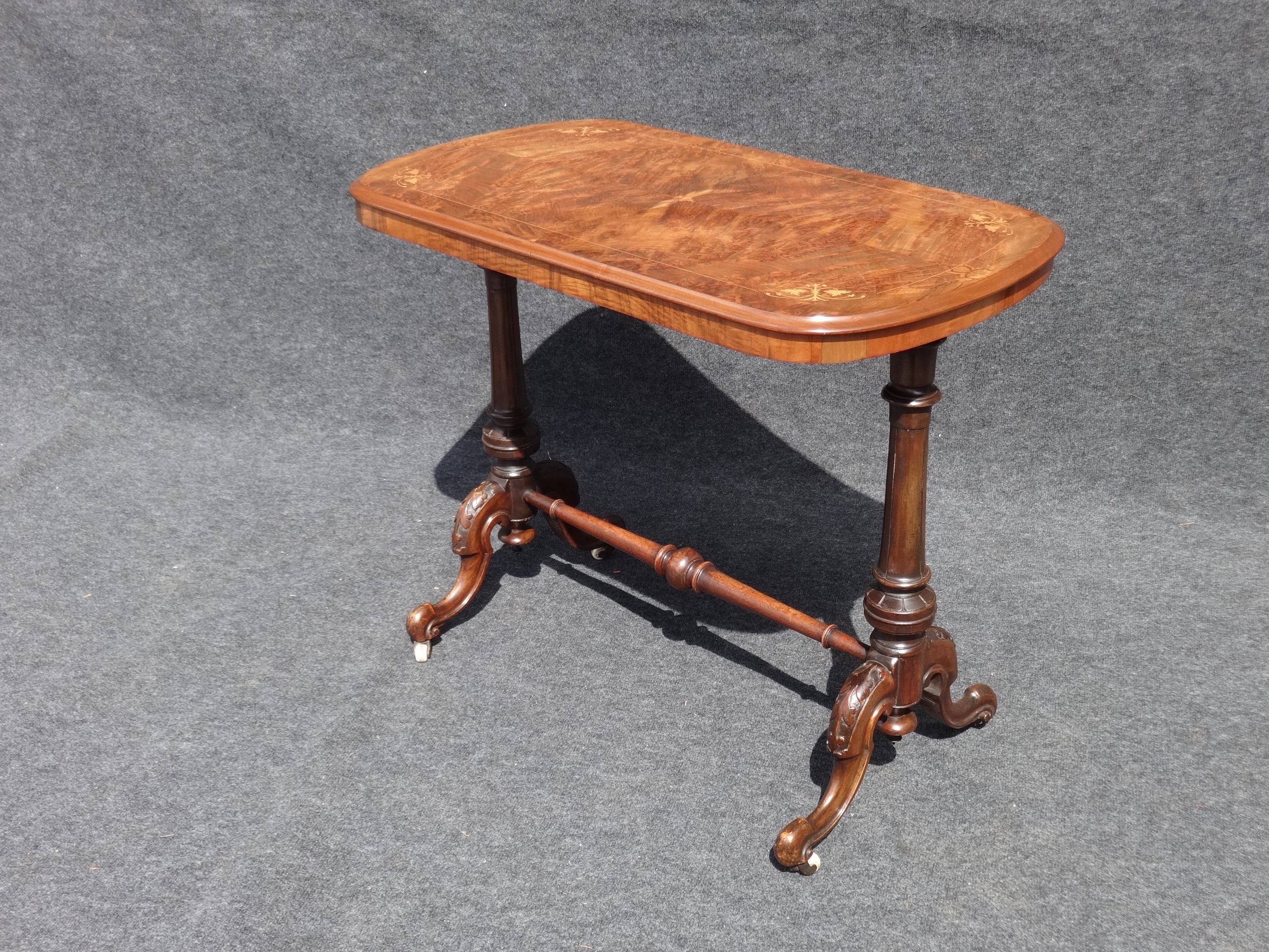 This is a fantastic antique 19th Century inlaid burr walnut stretcher table that is of an excellent colour and condition.