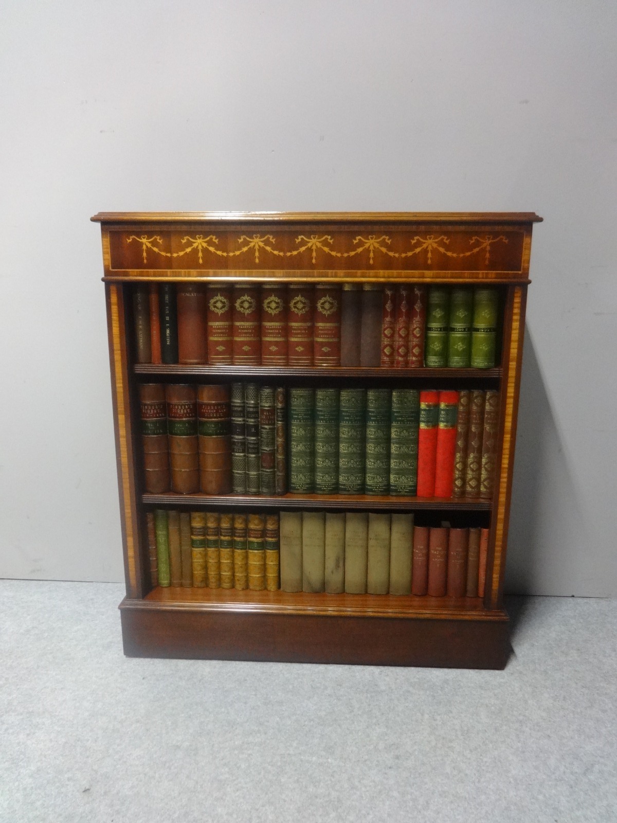 A very good mahogany adjustable open bookcase with tulipwood inlaid swags, in excellent condition.
