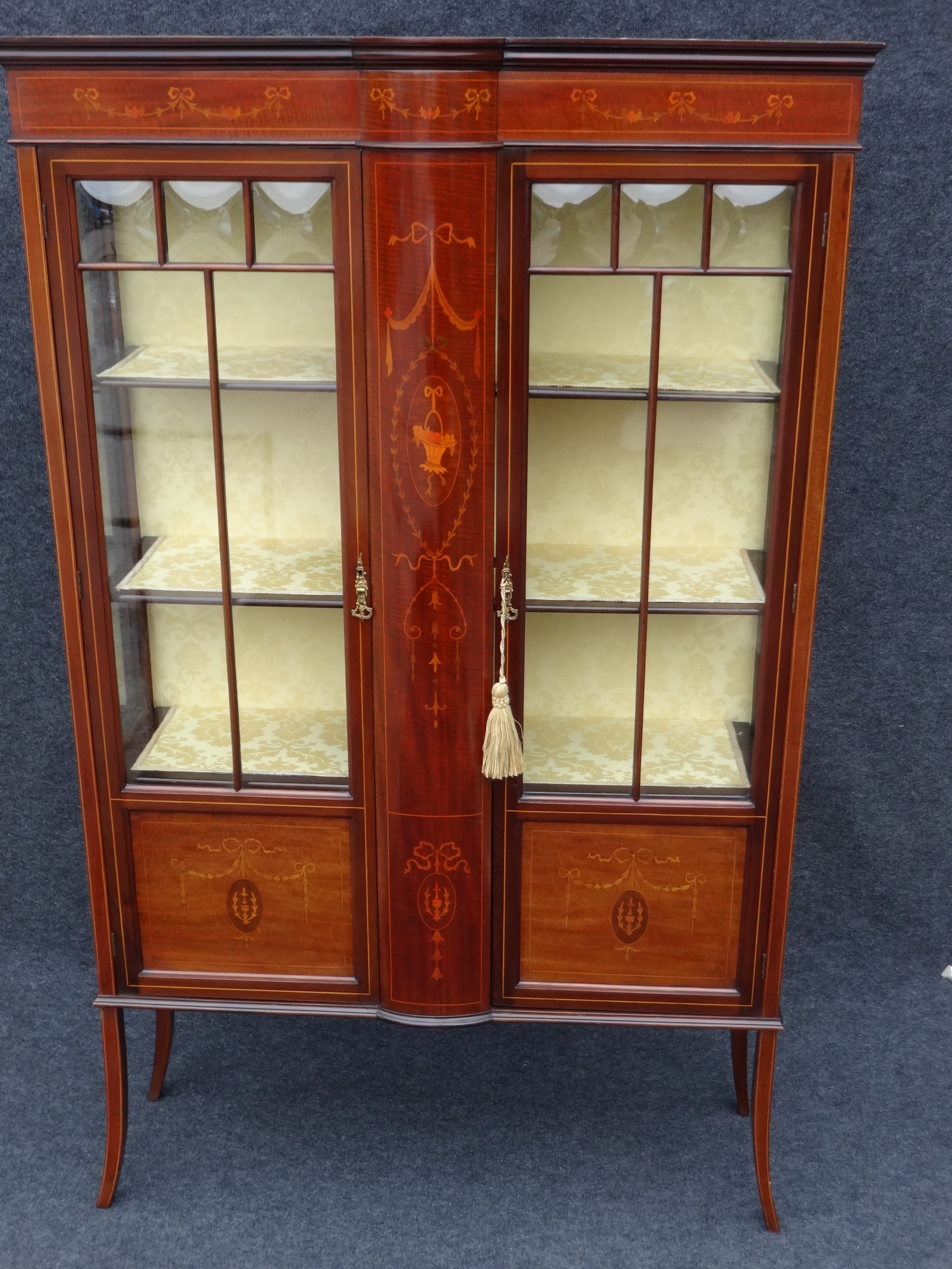 Bows and swags to the top, central panel with swags and basket of flowers, and swags to the bottom panels, convex top panes of glass, standing on outswept legs and newly lined.