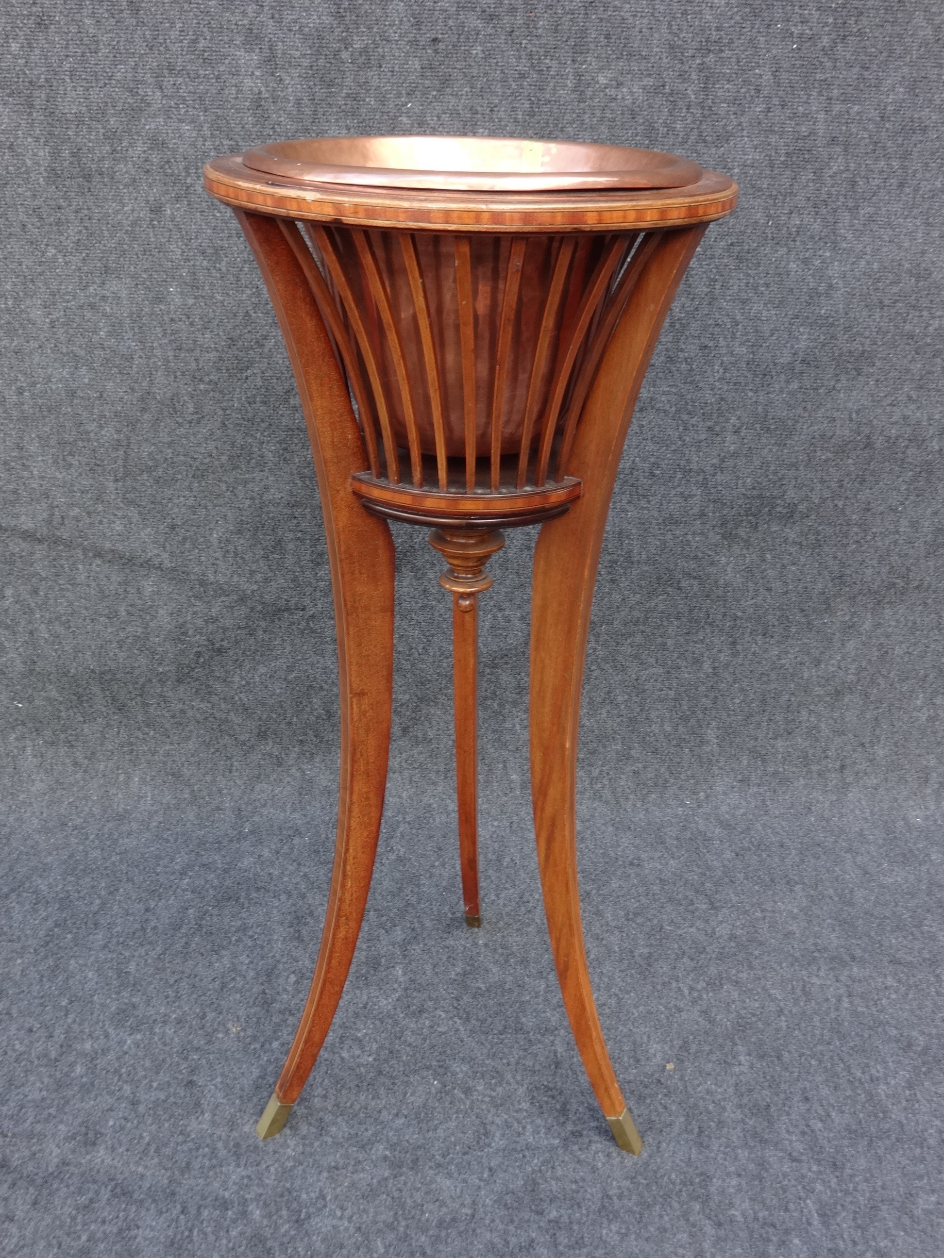This is an inlaid mahogany jardinière Stand with original copper liner, very pretty jardinere stand with boxwood and tulipwood inlays, standing on brass caps, in excellent original condition.
