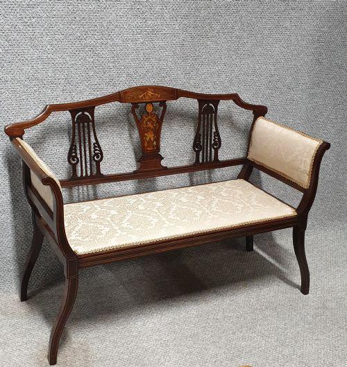 A very pretty Edwardian mahogany two seater window Sofa, couch, upholstered in cream damask, excellent colour and condition.