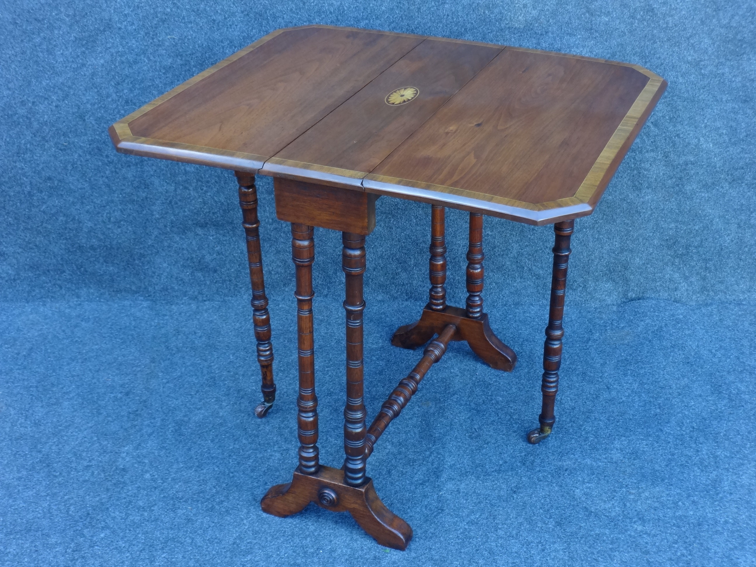 This is an inlaid walnut Sutherland table which stands on turned legs with brown pot castors. This is a very dinky walnut drop leaf sutherland table which is inlaid in the middle with a boxwood fan and crossbanded with walnut.