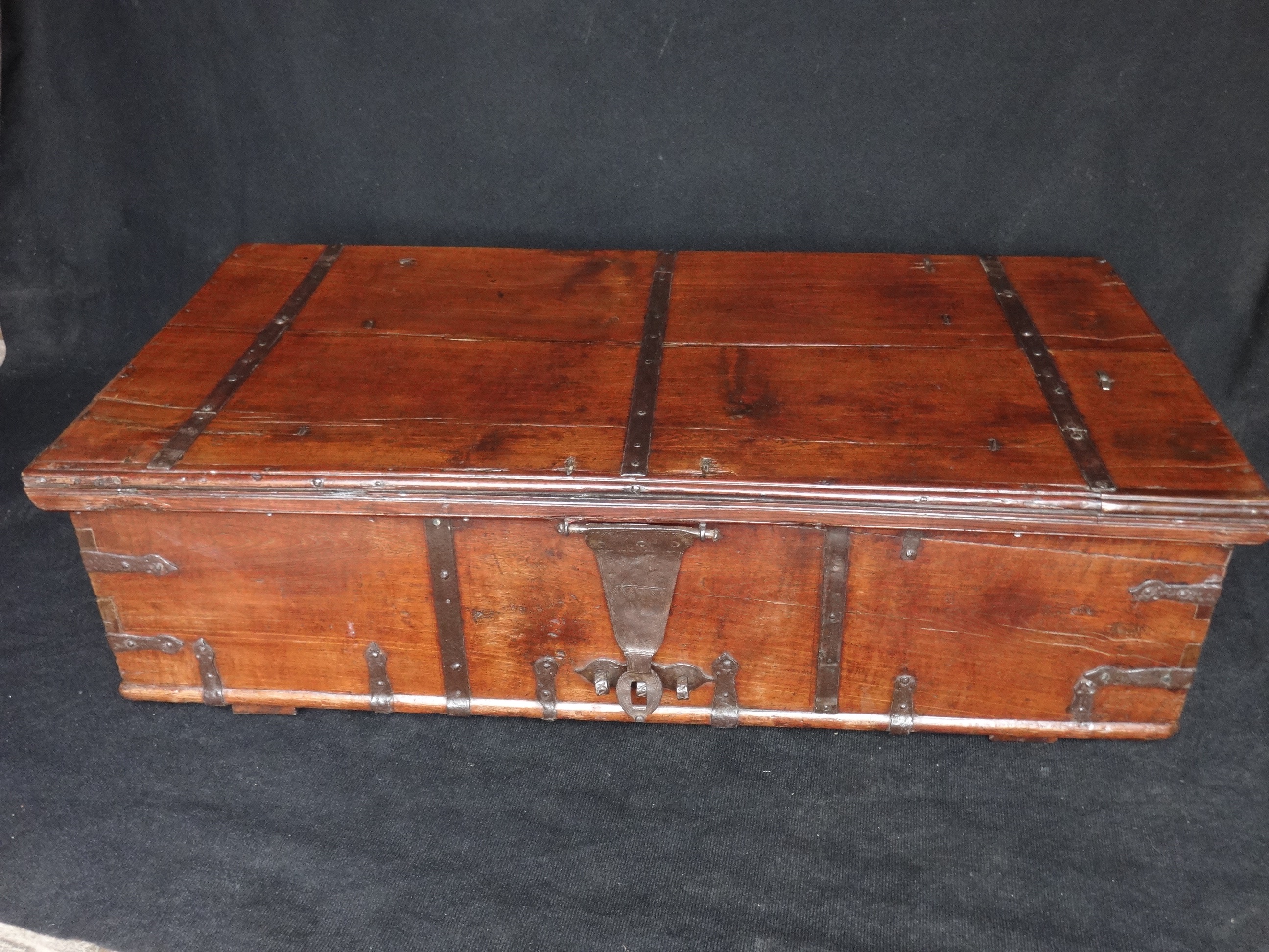 This is an excellent quality antique iron bound box (would make perfect coffee table). It has an excellent colour and has been restored to a very high standard.
