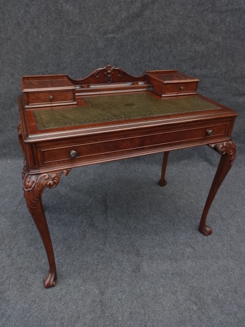 This is a very pretty ladies mahogany freestanding desk, superb quality, made in USA by Berkey and Gay, oak lined drawer, 2 small top drawers with pen tray, green leather, standing on very crisp carved legs.