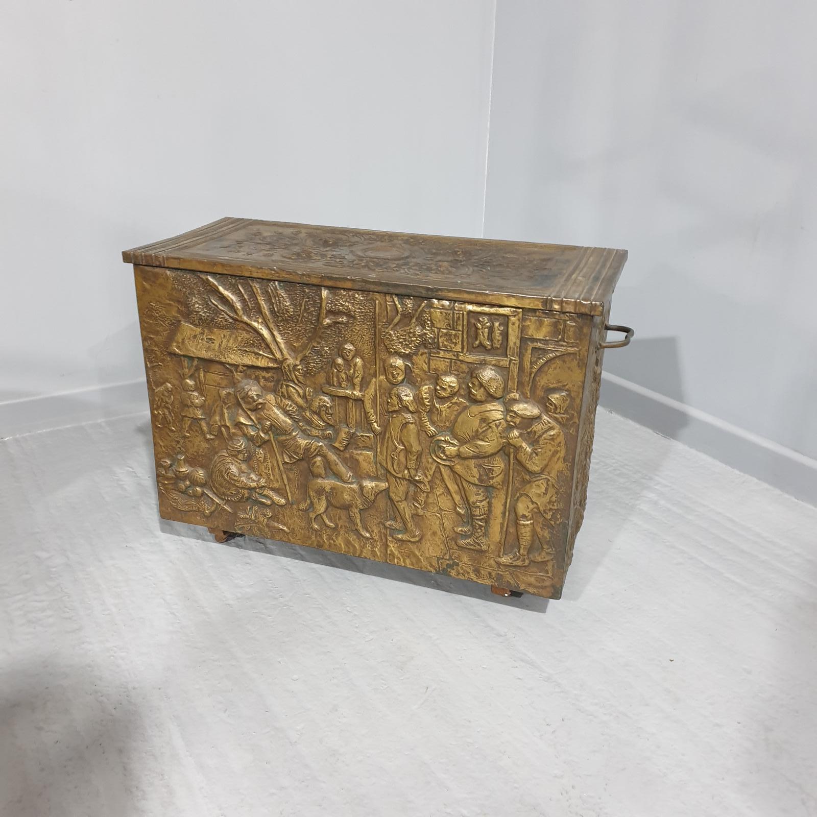 This is a very large antique brass plated log bin with hingled lid and pine linings, on castors, in very good overall condition.