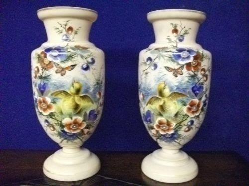 Large pale pink enameled vases featuring a bird chasing a butterfly with foilage and flowers. There are no cracks or chips. gilding rubbed.