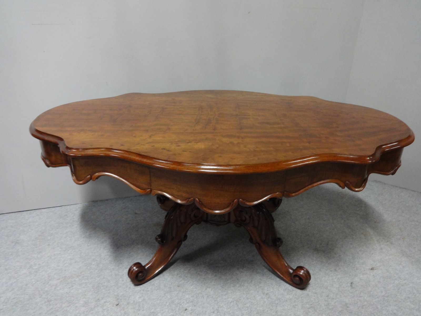 A very nice 19th Century French antique mahogany shaped coffee table with two opening drawers, central pedestal with excellent quality carving, in very good condition.